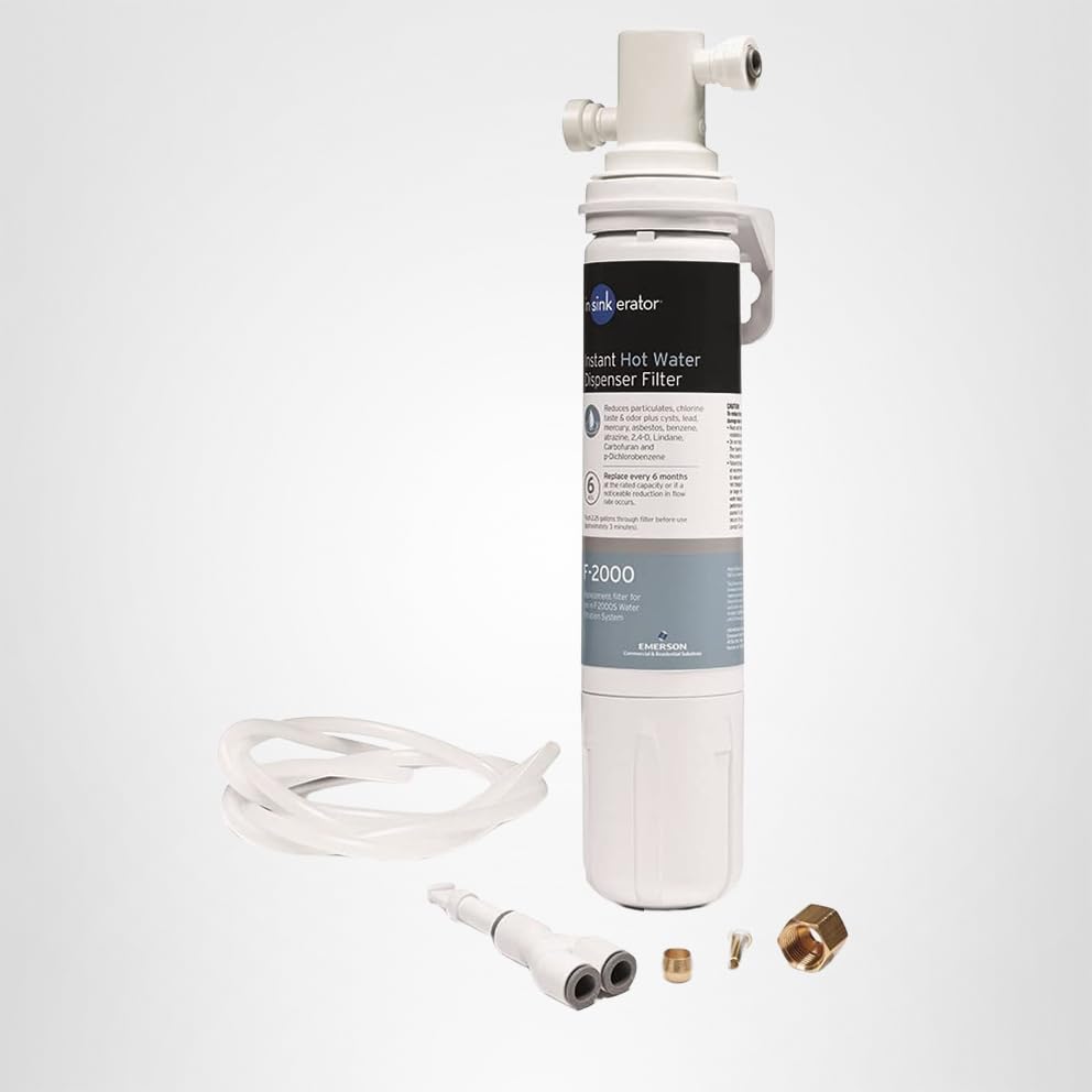 Product Description Designed for exclusive use with INSINKERATOR instant hot water tanks and faucets, the INSINKERATOR F-2000S Water Filtration System provides highly effective filtration for great-tasting filtered water right at your kitchen sink. Helping to filter out more than 12 contaminants, the F-2000S water filter system helps to filter VOCs, lead, mercury, asbestos, cysts, chlorine taste and odor, and more, while also helping to improve your water’s taste and smell. Plus, using a water filtration system helps to reduce the volume of single-use, plastic bottles ending up in landfills. With its 1/4-inch quick-connect fitting featuring a twist-and-lock design, the water filter also is easy to replace when necessary. Select a compatible INSINKERATOR instant hot water tank and a faucet with both hot and cold options (sold separately) to enjoy filtered hot water and filtered drinking water right from your dispenser. INSINKERATOR. KITCHEN BETTER. From the Manufacturer The new F-2000S water filtration system replaces the F-601R. The filter removes particulates, chlorine, taste and odor plus cysts, lead, mercury, asbestos, benzene, atrazine, 2,4-D, Lindane, Carbofuran and p-Dichlorobenzene.