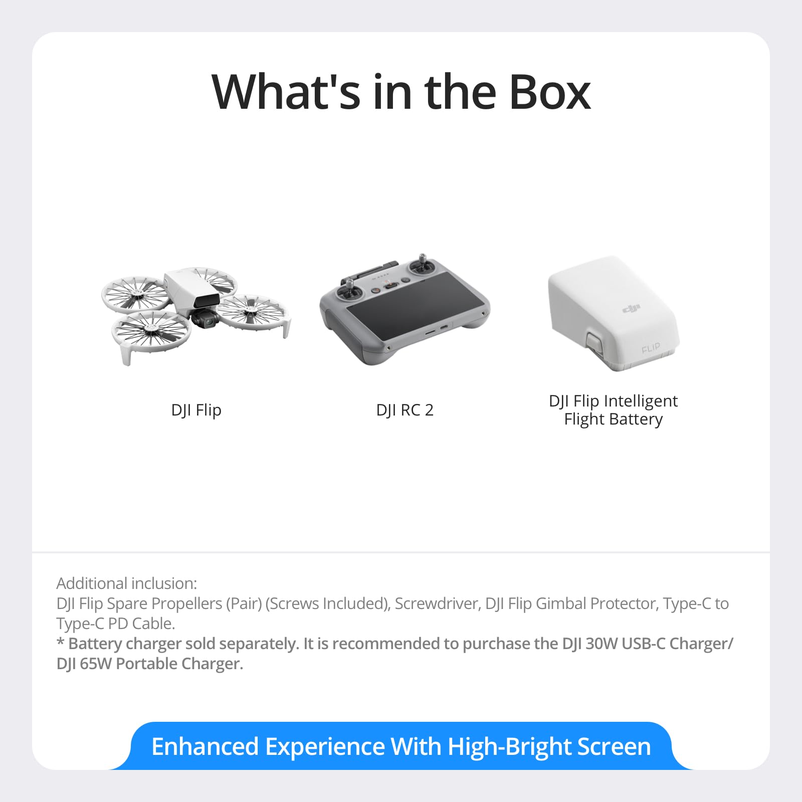 Overview: DJI Flip combines a compact design with exceptional imaging. It supports palm takeoff with no remote needed. Subject tracking keeps you in focus. Foldable propeller guards ensure portability and safety. DJI Flip comes in 3 purchasing options: DJI Flip includes the DJI Flip, DJI RC-N3 remote controller, one Intelligent Flight Battery, and more. DJI Flip (DJI RC 2) includes the DJI Flip, RC 2 remote controller with a high-bright screen, one battery, and more. DJI Flip Fly More Combo (DJI RC 2) includes the DJI Flip, RC 2 remote controller with a high-bright screen, three batteries for extended flight time, a Parallel Charging Hub, and more. * Battery charger sold separately. It is recommended to purchase the DJI 30W USB-C Charger/DJI 65W Portable Charger.