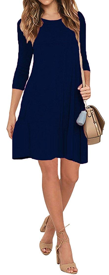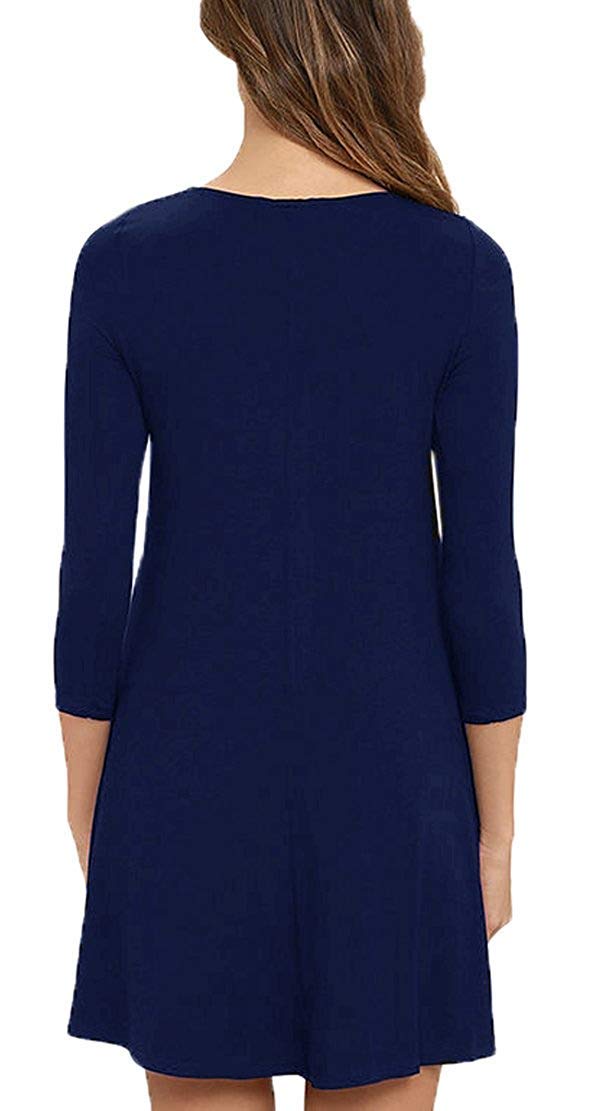 Features: casual basic style, A-line silhouette, 3/4 sleeves/sleeveless ,round neck, super soft.the casual dresses is above the knees and long enough that you wouldn't need to wear leggings with it if you didn't want too.It's a swing style so it would fit comofrtably over large hips.the pockets are such a nice addition,it's loose enough but not baggy.