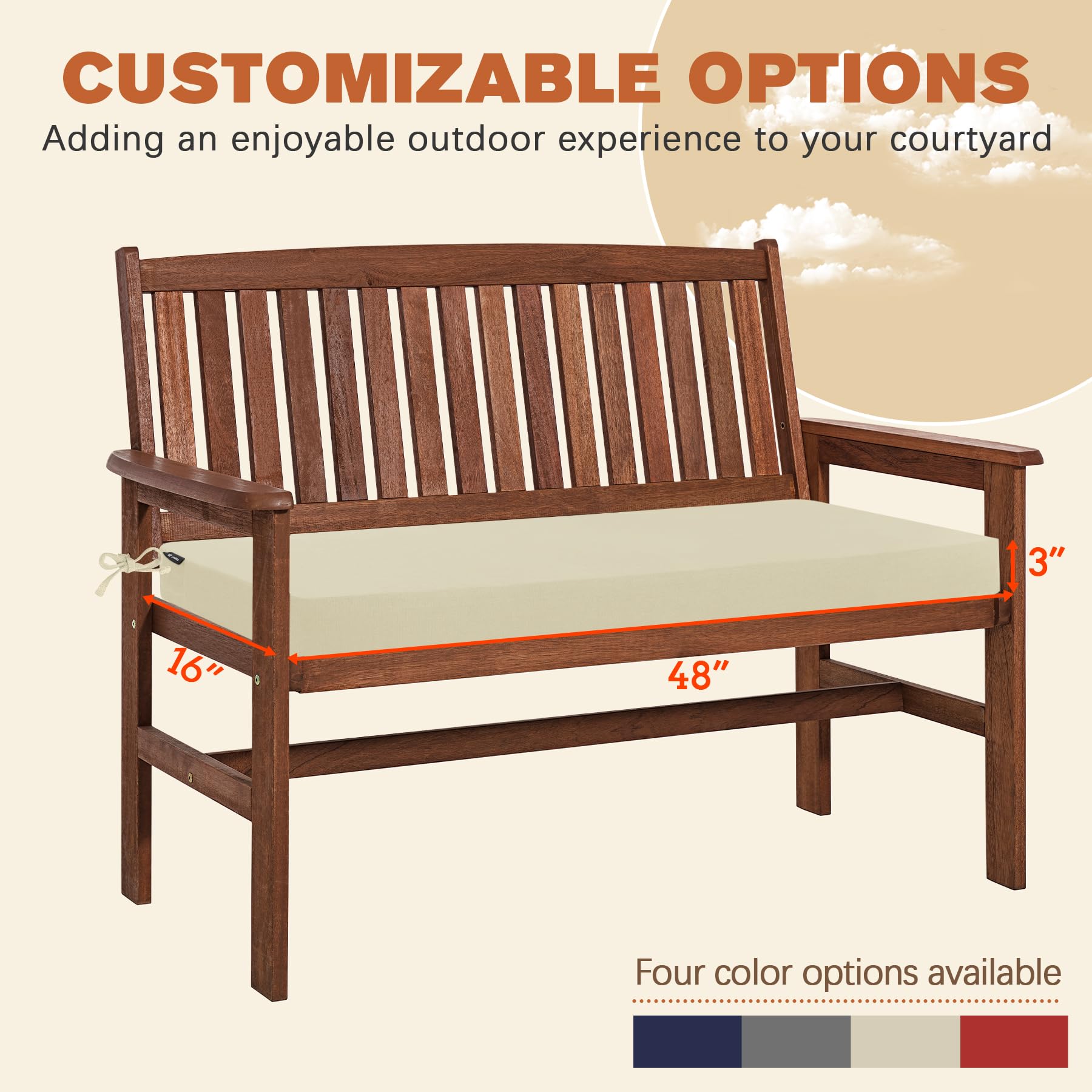 Size Selection: Including 1 bench cushion measuring 48” W x 16” D ( The size description is only for the cushion size, accurately measuring the dimensions of your furniture's seating area in advance, make sure the cushion size fits your furniture ).