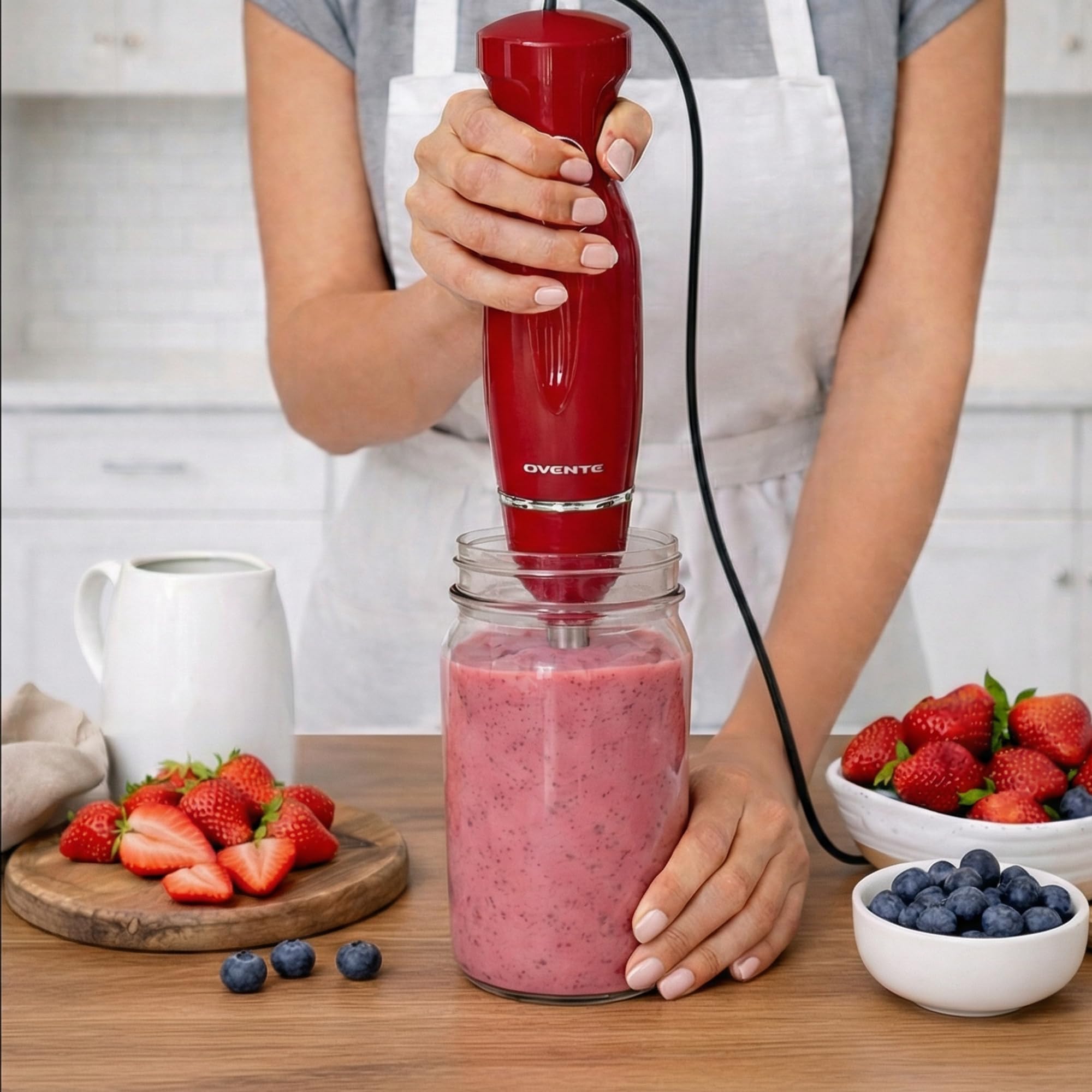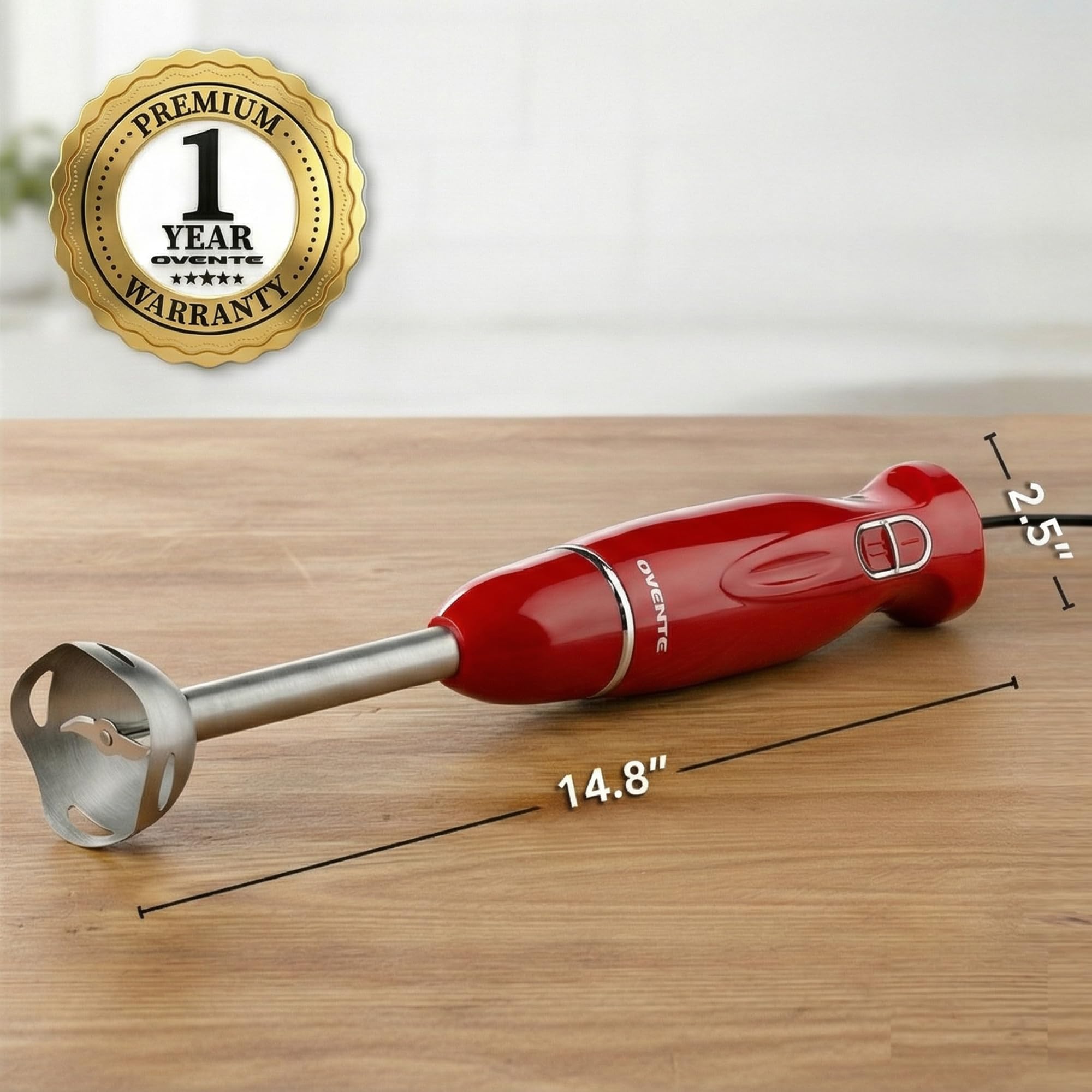 Witness ease, convenience, and versatility at work—right in your own kitchen. Discover a new world of innovative cooking possibilities with the OVENTE Handheld Immersion Blender HS560 Series. Blending and mixing soft foods becomes a breeze, making it so easy and effortless that it may even turn into fun! Its lightweight body and ergonomically-designed, non-slip handle ensure comfortable control, so cooking will never feel like a chore again. Whip up all your favorite gourmet soups, guacamole, smoothies, shakes, cake batter, salsas, sauces, marinades, salad dressings, or even homemade baby food for your little one with just one press of a button. Powered by a 300-watt motor, it works quickly and efficiently, expertly blending ingredients into a smooth, evenly-mixed medley of mouth-watering flavors. The slim-stick design allows this hand blender to fit into any mixing bowl, pot, beaker, or cookware without restriction. It’s compact enough for convenient storage yet powerful enough for tough blending jobs. Plus, it’s designed to come apart easily for hassle-free cleaning. Simply disassemble the parts, hand wash the shaft, or place it in the dishwasher. The motor body can be wiped clean with a soft damp cloth. NOTE: To prevent overheating, operate the hand blender in one-minute intervals or less.