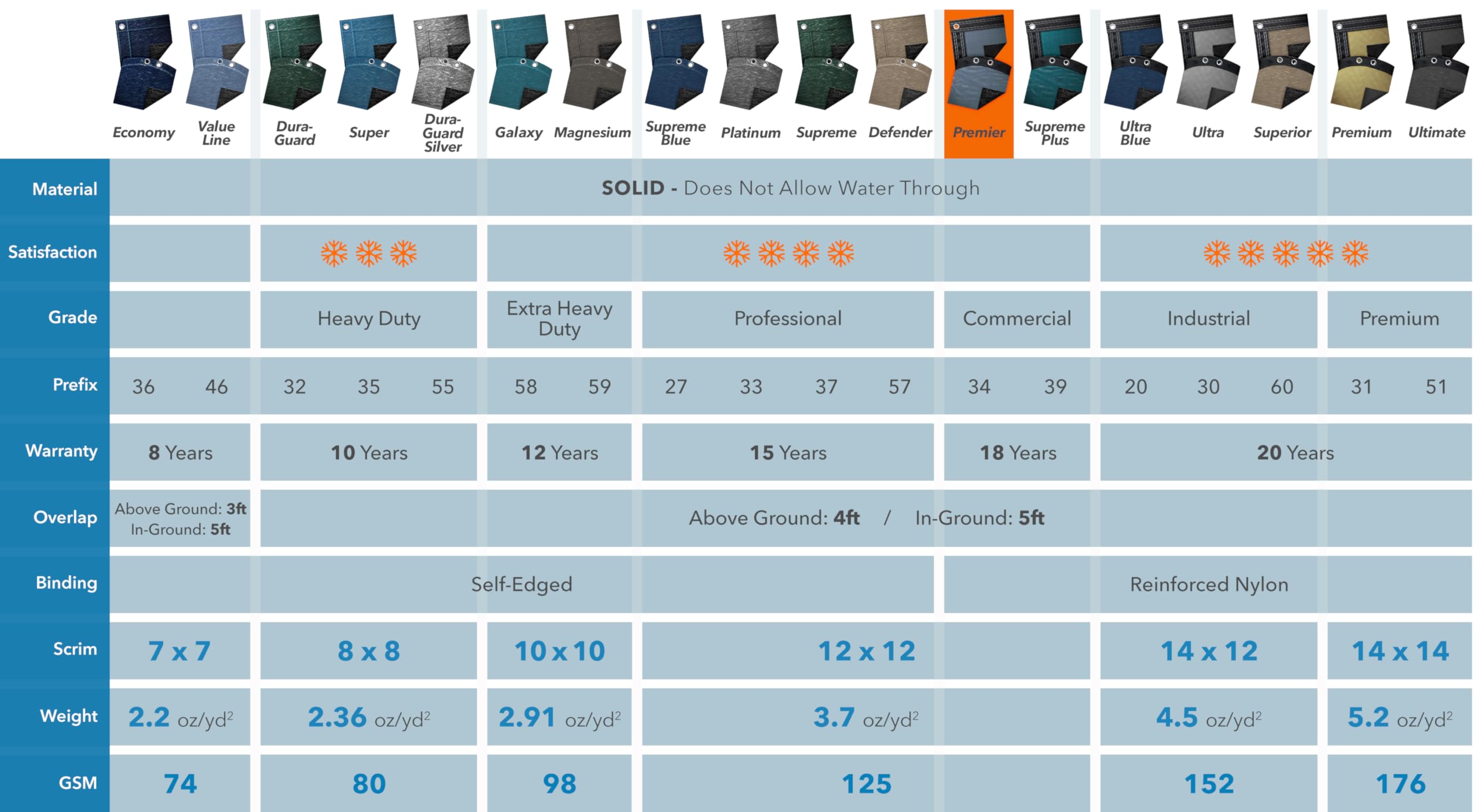 This Commercial pool cover is constructed with commercial polyethylene that weighs 3.7 ounces per square yard (125 grams per square meter). The material is woven with a 12 x 12 scrim. Scrim is the number of threads per square inch. Material weight and scrim are the best indicators of the overall durability and expected longevity of your pool cover.