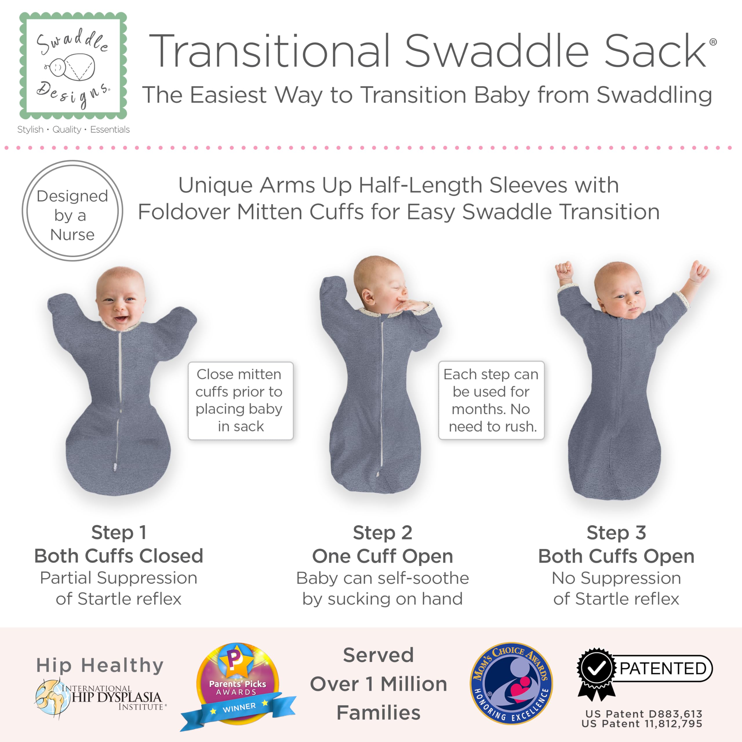 The Transitional Swaddle Sack is the easiest & safest way to wean baby from a traditional swaddle. The arms up sleeve design allows baby to self-soothe and the unique ½-length sleeves with foldover mitten cuffs closed provide partial suppression of the Startle Reflex to promote better sleep. Importantly, the patented design is safer because baby can use their arms if baby rolls over during sleep. The Transitional Swaddle Sack is ideal for babies who prefer to sleep with arms up, babies who are starting to rollover, and babies who break out of a traditional swaddle. The uniquely-shaped, ½-length sleeves are not full length, so when mitten cuffs are closed, baby’s arms will be flexed close to body for swaddle snugness. The foldover mitten cuffs may be worn open or closed. Caregiver can open one or both cuffs, so baby can self-soothe by sucking directly on hand. Helpful 2-way zipper with 2 zipper pulls. The zipper zips down from the top to make it easy to place baby in the sack and zips up from the bottom to make it easy to change baby’s diaper. Designed by a nurse. US patent, D833,613 with patents in EU, UK, China, Japan, Korea.
