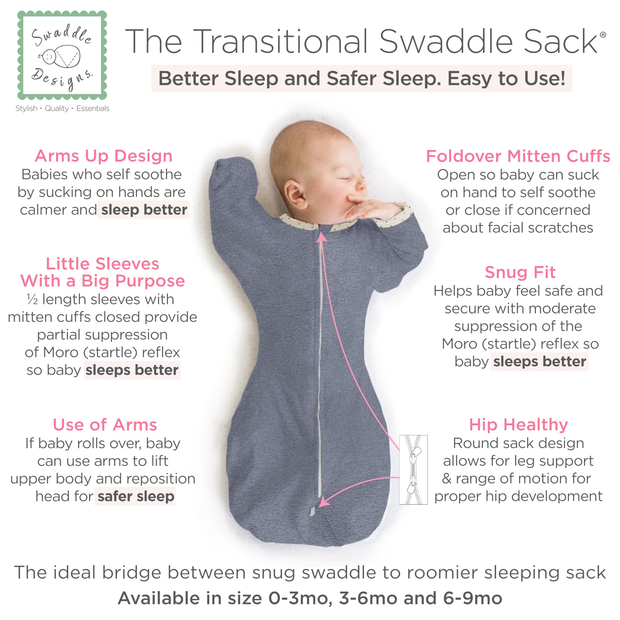 EASIEST way to move from a traditional swaddle to a wearable blanket; The Transitional Swaddle Sack is not a tight swaddle nor a loose sack; the snug fit helps baby feel secure and the special sleeves allow baby to use their arms for SAFER & BETTER SLEEP