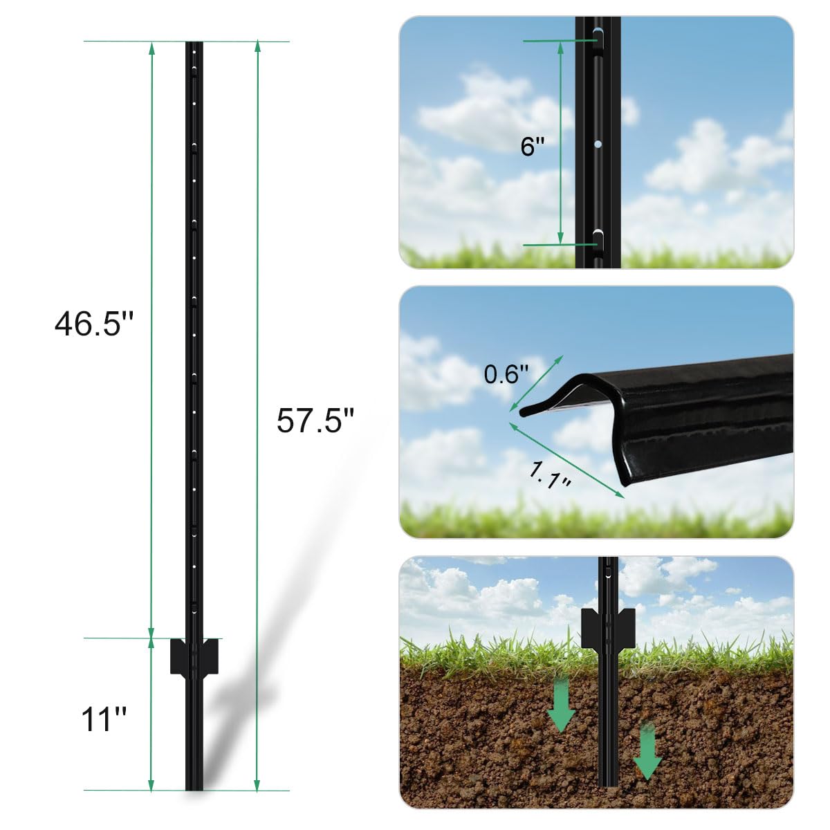 Fast and Easy Installation: 11” length is fixed into the ground and the upper part is for fencing, total 4.8 feet, which is a great garden fence post. No digging required, simply you can pond the U fence posts with a hammer or post-driver into the dirt, and drive it into ground until anchor plate is below ground level. Easily attach the fence wire on the metal post tabs, then the fence is pulled up and supported well.