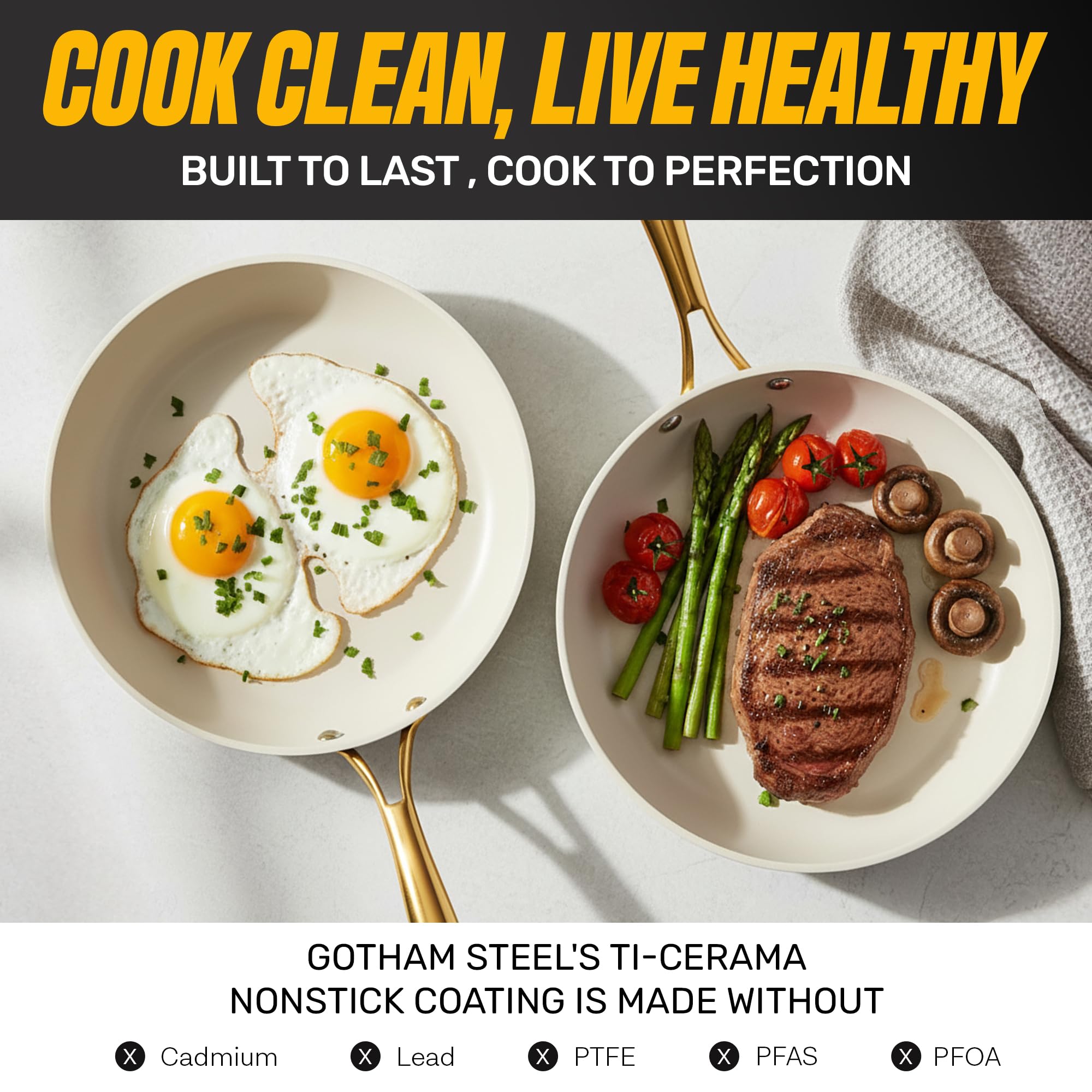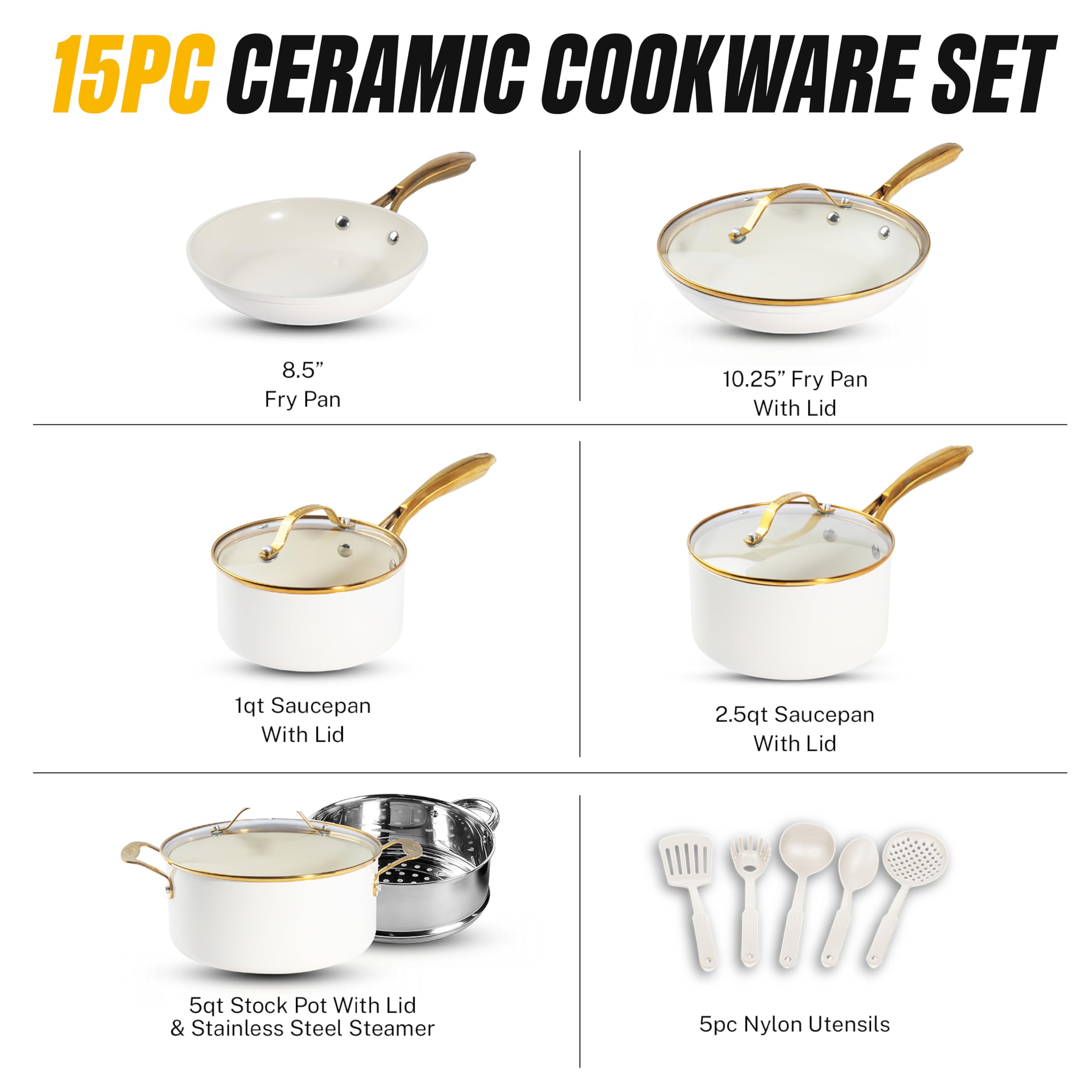 Gotham Steel 15 Pc Ceramic Cookware Set, Ceramic Pots and Pans Set Non Stick with Cooking Utensils and Steamer, Non Toxic PFOA PFOS Free, Premium Gold Stay Cool Handles, Oven & Dishwasher Safe