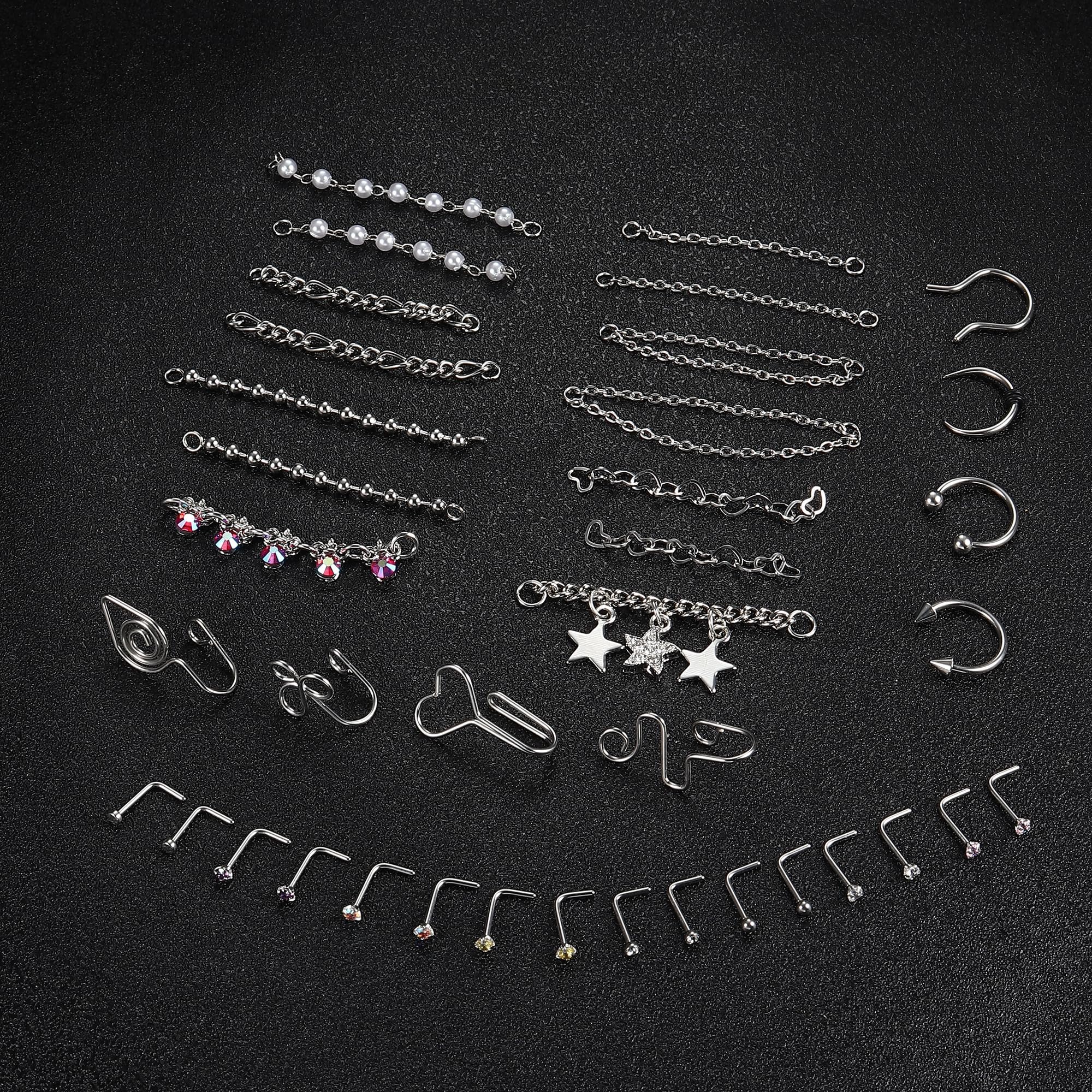 [Nose Chain Piercing Set] Come With 16Pcs L Shaped Nose Studs,4Pcs Horseshoe Septum Rings, 4Pcs African Style Nose Cuff and 14Pcs Nose Chains of Different Length and Styles. Fashionable Nose Chain Piercings Catch Eyes in the Crowd. Different Colors One Set, More Choice for Daily Wearing.