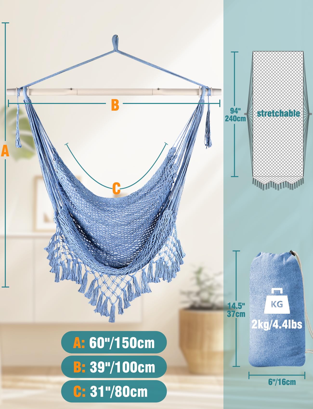 Comfort and Health benefits: They offer a gentle swaying motion that can be very soothing.Hammock chairs are incredibly comfortable and provide a unique sitting experience that can offer several health benefits, including improved circulation, reduced muscle tension, and better sleep quality.Strong metal spreader bar promotes your long lasting enjoyment.