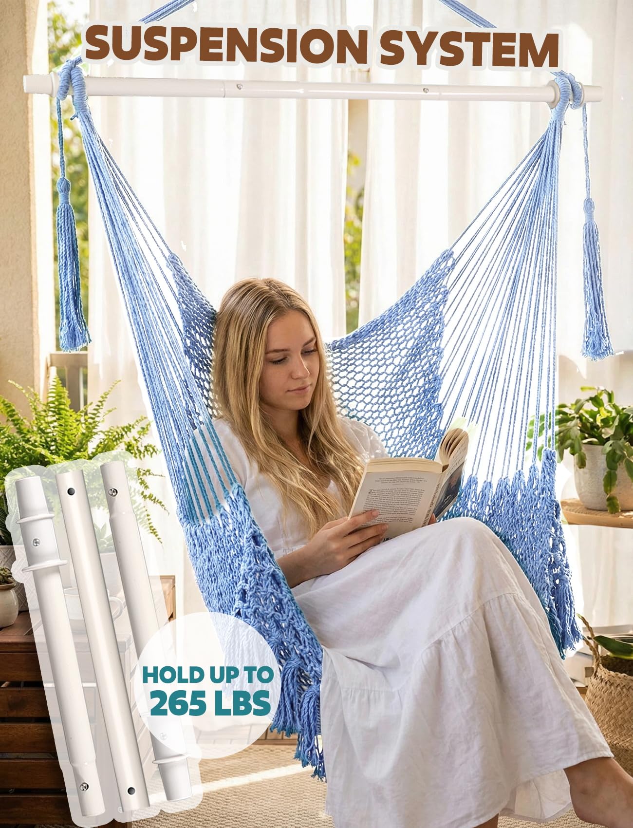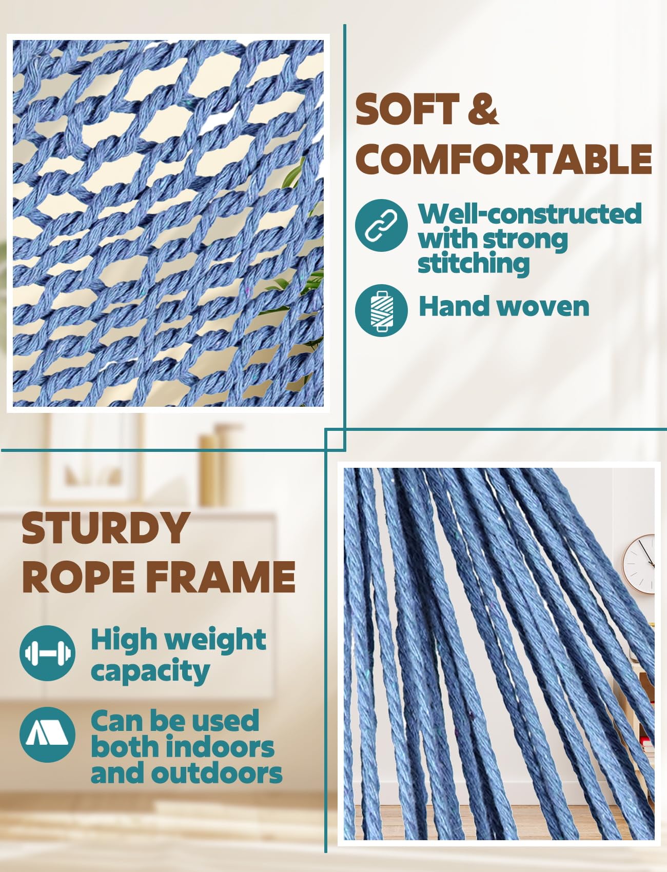 Design:Handcrafted from comfy and durable cotton ropes of the entire chair promise enjoyment and that is well-constructed with strong stitching and a sturdy frame to ensure safety and comfort.100 cm(3 1/3 ft) length wide spreader bar provides ample shoulder room.Extra long built in footrest to really stretch out .The mesh lets the cool breeze blow your body, breathable and cool.Anti-slip poles provide a stable and secure seating experience, preventing from slipping or sliding off the chair.