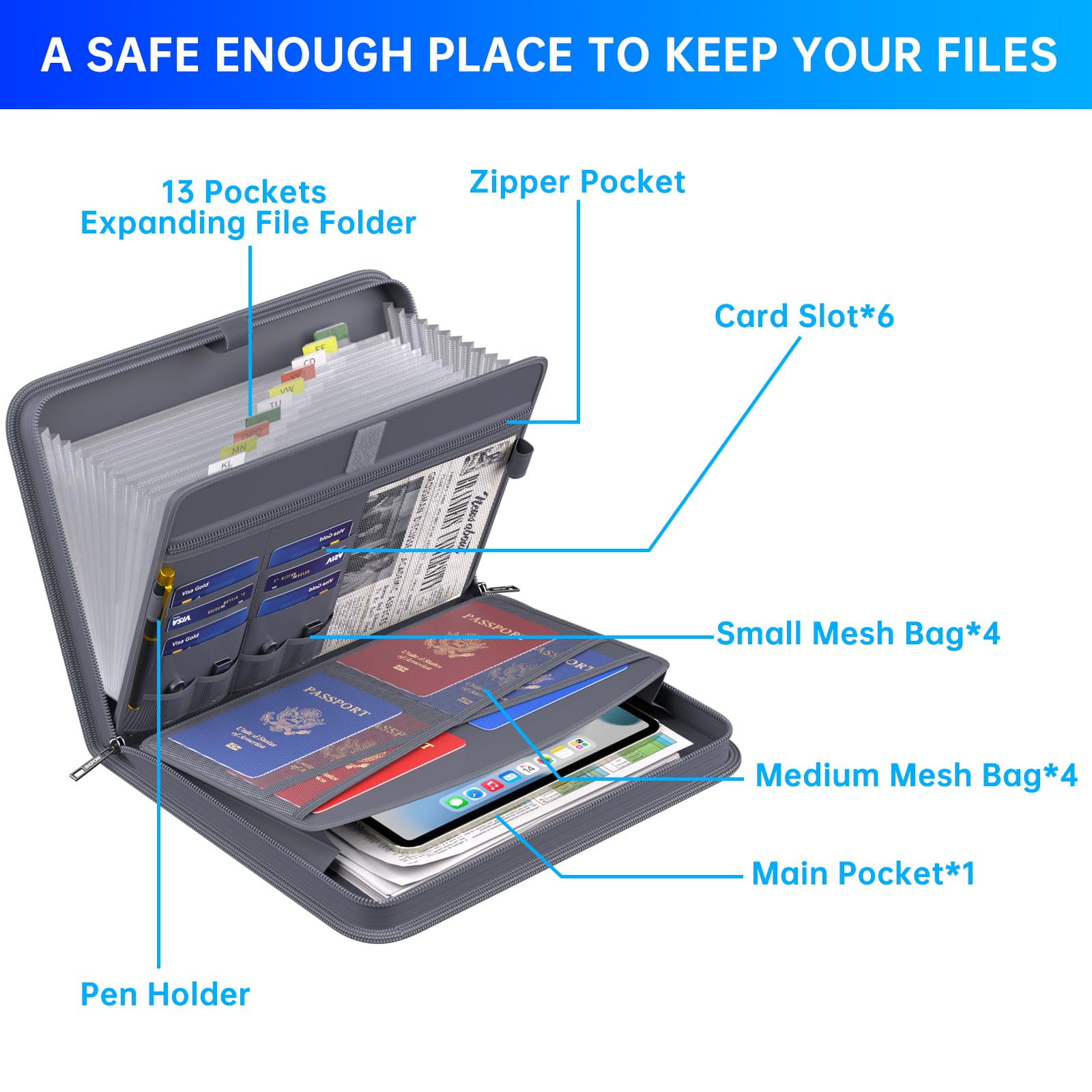 Large Capacity: 14.2" x 10.4" x 2", Compared with other folders, our Accordian File Organizer adopts a multi-layer design that can meet all your storage needs.These include 13 accordion Pockets with labels(each expanding to 1.2 inches),1 zipper pocket,2 pen slot,6 card slots,4 small mesh bags,4 medium mesh bags,and 1 main pocket. You can securely store all your important documents and other items in this fireproof expanding file folder while effectively classifying and finding your files.