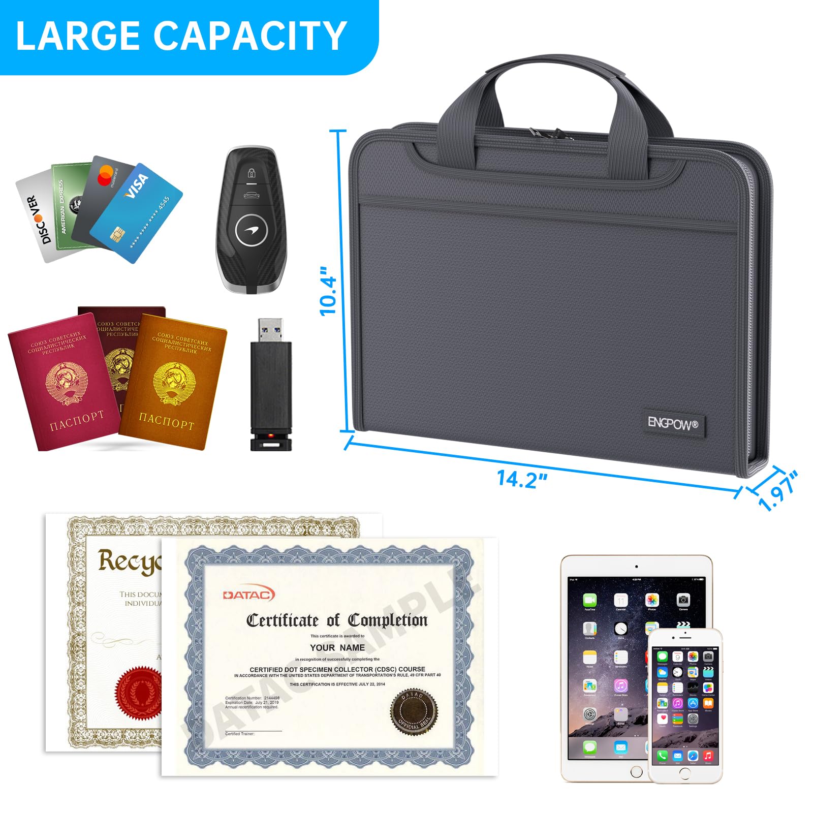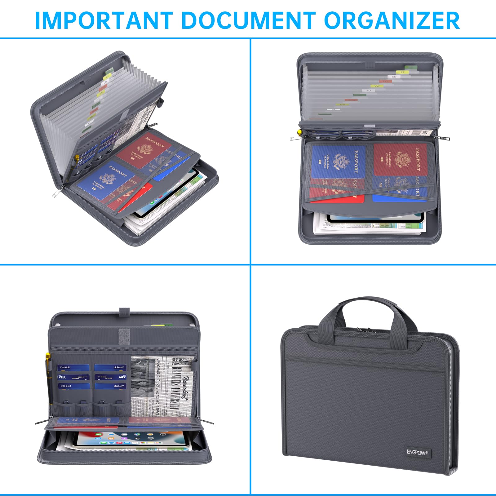 Accordion File Organizer: A Safe Enough Folder to Keep Your Files. Say goodbye to cluttered files and disorganization with ENGPOW's file organizer folders. Compared with other folders,our fireproof folders is allows you to neatly store and classify letter/A4 files, receipts, cards, USB drives, pen, passports and more in a safe and orderly way. Perfect for daily file filing and storage.The Non-dusty material can prevent dust from sticking to the outside of our folder,always keep it neat and tidy.