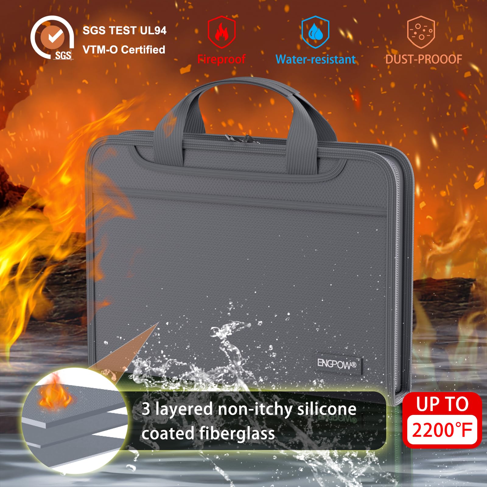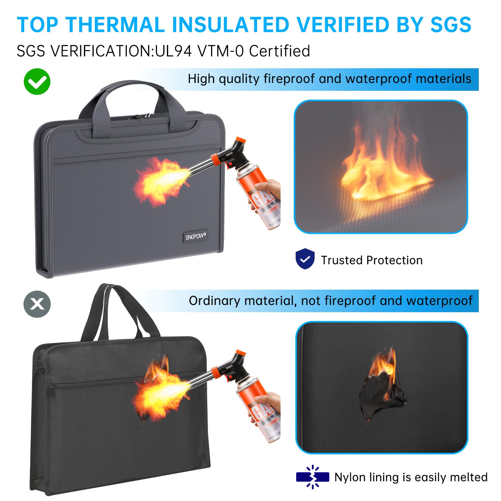 High-Quality Materials: Protect your files with ENGPOW fireproof accordion file organizer.It is made of 3-layered non-itchy silicone-coated fiberglass which withstand the temperature up to 2200℉.It has been passed by SGS TEST(UL94 VTM-0 Certified).Fireproof File Folder is fireproof&Water-resistant,which can effectively protect your important documents in a fire,flood,and wet weather. They will further keep your files intact.Giving you time to save your important documents when disaster strikes