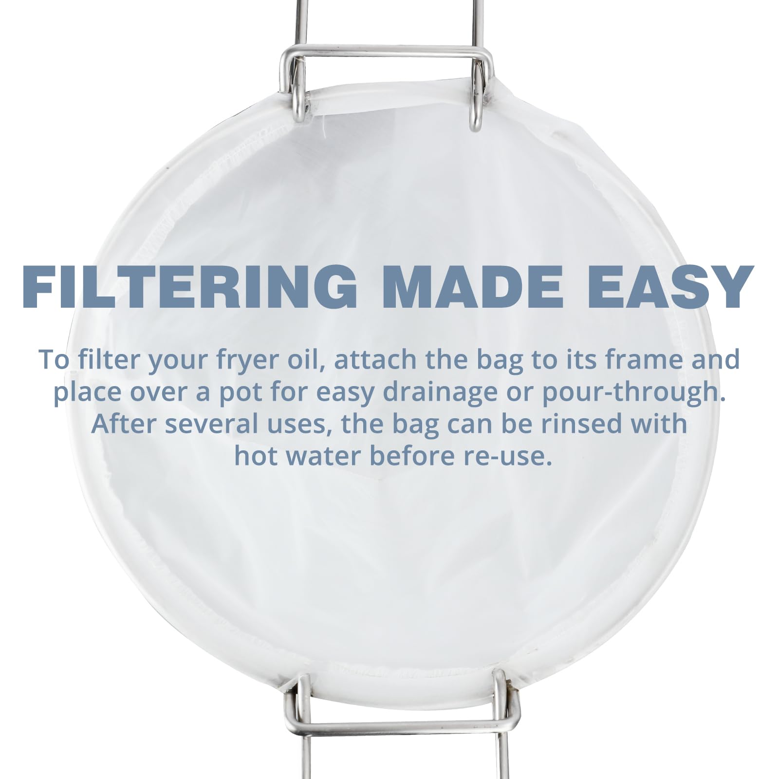 FILTERING MADE ESAY: To filter your fryer oil, attach the bag to its frame and place it over a pot for easy drainage or pour-through. The hook will stabilize the strainer, freeing both hands to press the product through the fine mesh. For easy lifting that keeps hands at a safe distance from the heat, the handle guarantees safety with its durable design and ample length. After several uses, the bag can be rinsed with hot water before re-use
