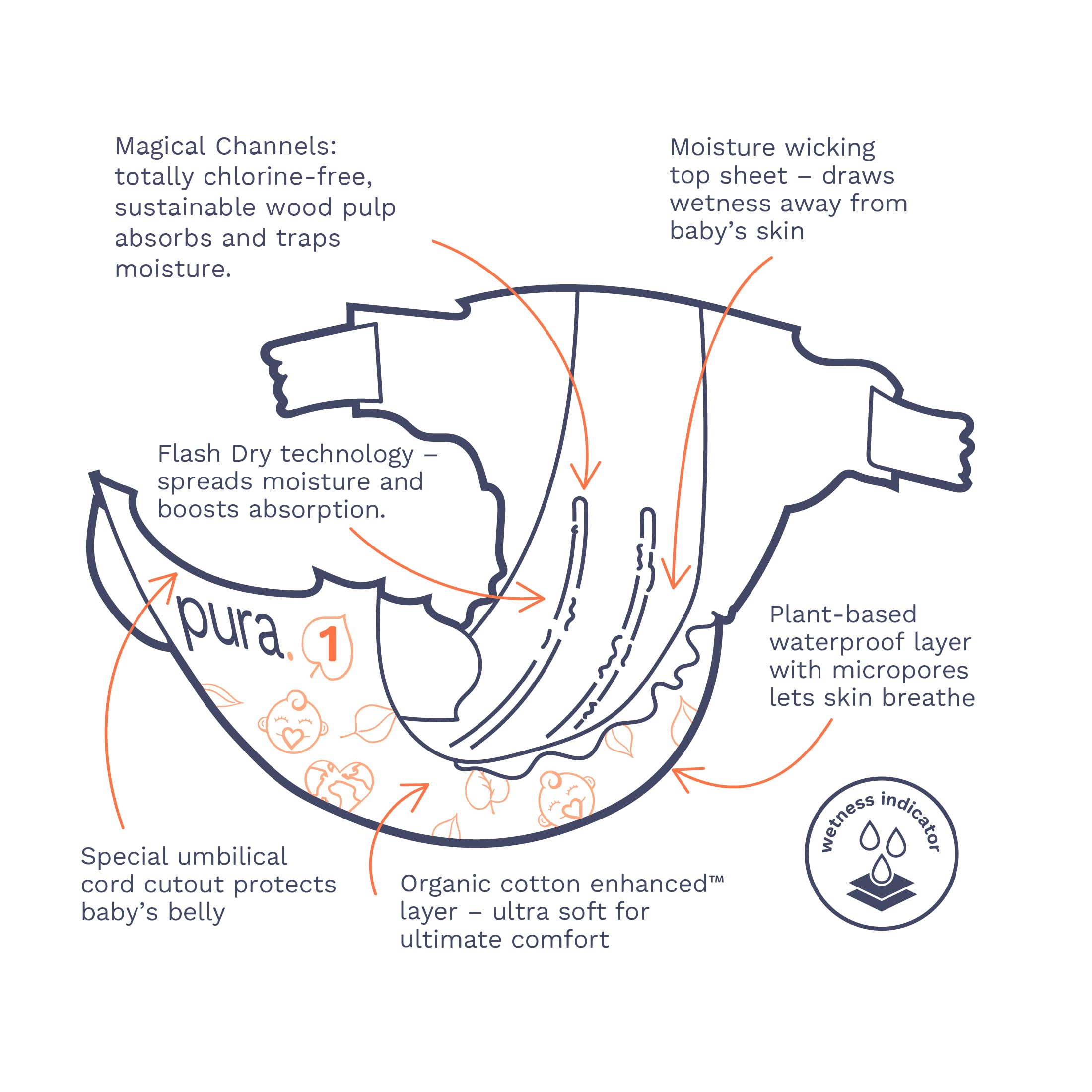 GOOD FOR THE PLANET: Pura’s diapers are manufactured in a carbon neutral plant, powered by green electricity. Where possible, we’ve replaced non-sustainable materials with lower impact materials such as wood pulp from sustainably managed forests in the absorbent core of our diapers. Our packaging is made from paper, so it's easier to recycle!