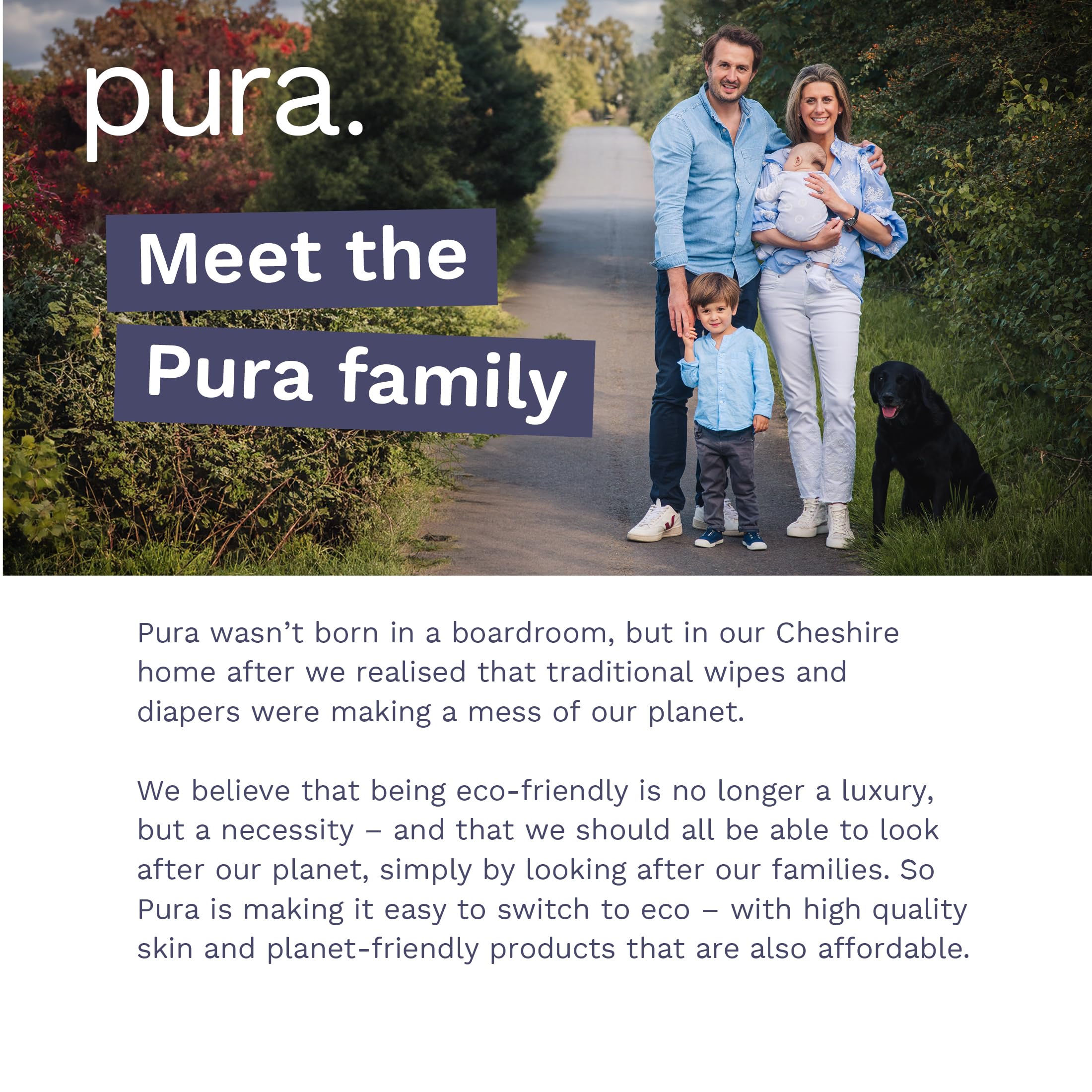 We set out to create a high performance, low environmental impact diaper that doesn’t compromise on skin safety, comfort or value for money. Approved by dermatologists to be gentle on sensitive, newborn skin, our diapers feature an umbilical cut-out to protect the delicate belly area and a handy color changing wetness indicator. Organic cotton enhanced, with plant-based materials against babies’ skin, they’re luxuriously soft and verified by Allergy UK as skin-safe as well as being sustainably made. Meet the Pura family Pura didn’t start in a boardroom. It was born in the British home of Guy and Abi Fennell. Created by parents, for parents, Pura was founded to make clean, safe and planet-friendly products affordable for all. Pura is a Carbon Neutral business and a certified B-Corp.