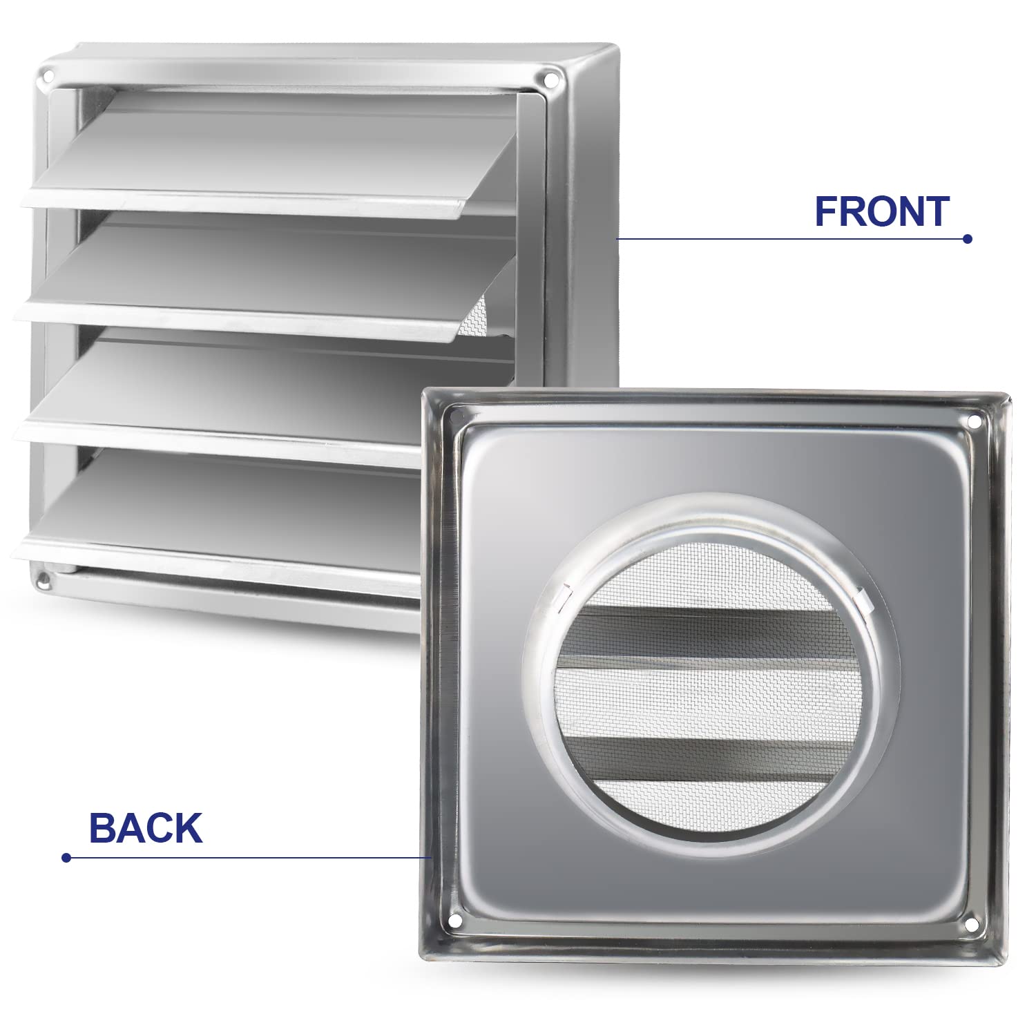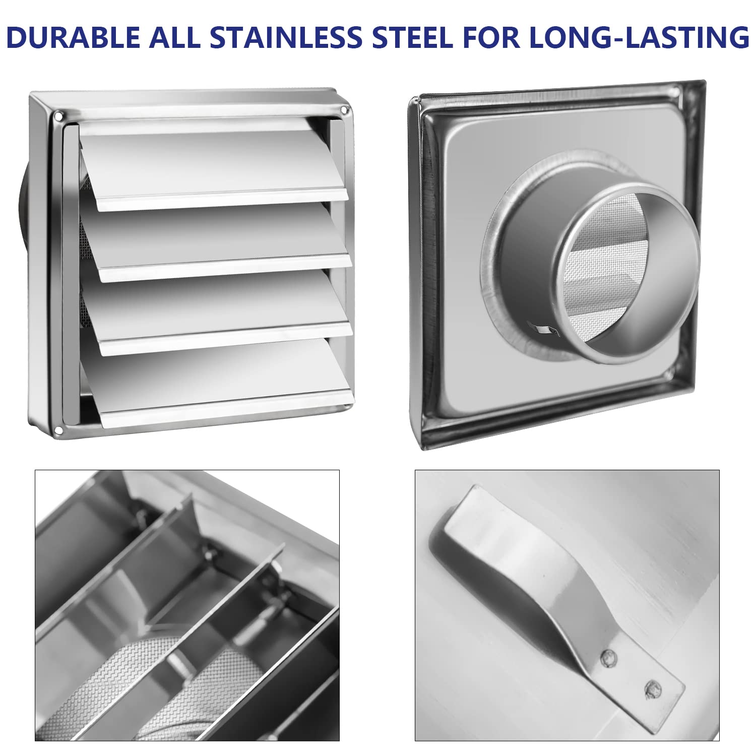 HIGH QUALITY MATERIALS: Our exterior wall vent hood is made of 304 stainless steel material well-tested by the manufacturer, provide rust and corrosion resistance in any weather conditions. The self-closing shutter flaps will protect your equipment Safe from annoying rodents like mice, rats, birds, snake and squirrels. In addition you can disassemble the wire mesh for optimal ventilation efficiency