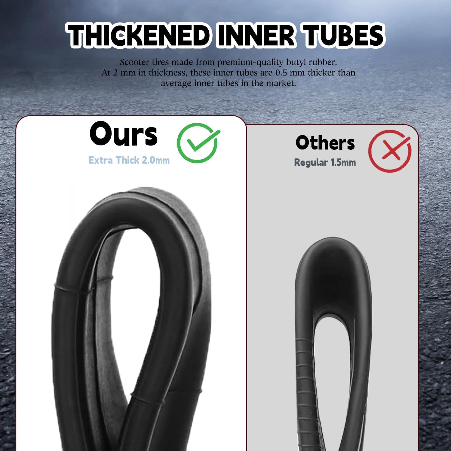 【Thickened Inner Tubes】10 inch scooter tires made from premium-quality butyl rubber. At 2 mm in thickness, these inner tubes are 0.5 mm thicker than average inner tubes in the market. Thick and uniform inner tube for maximum comfort while providing required strength, flexibility and durability.
