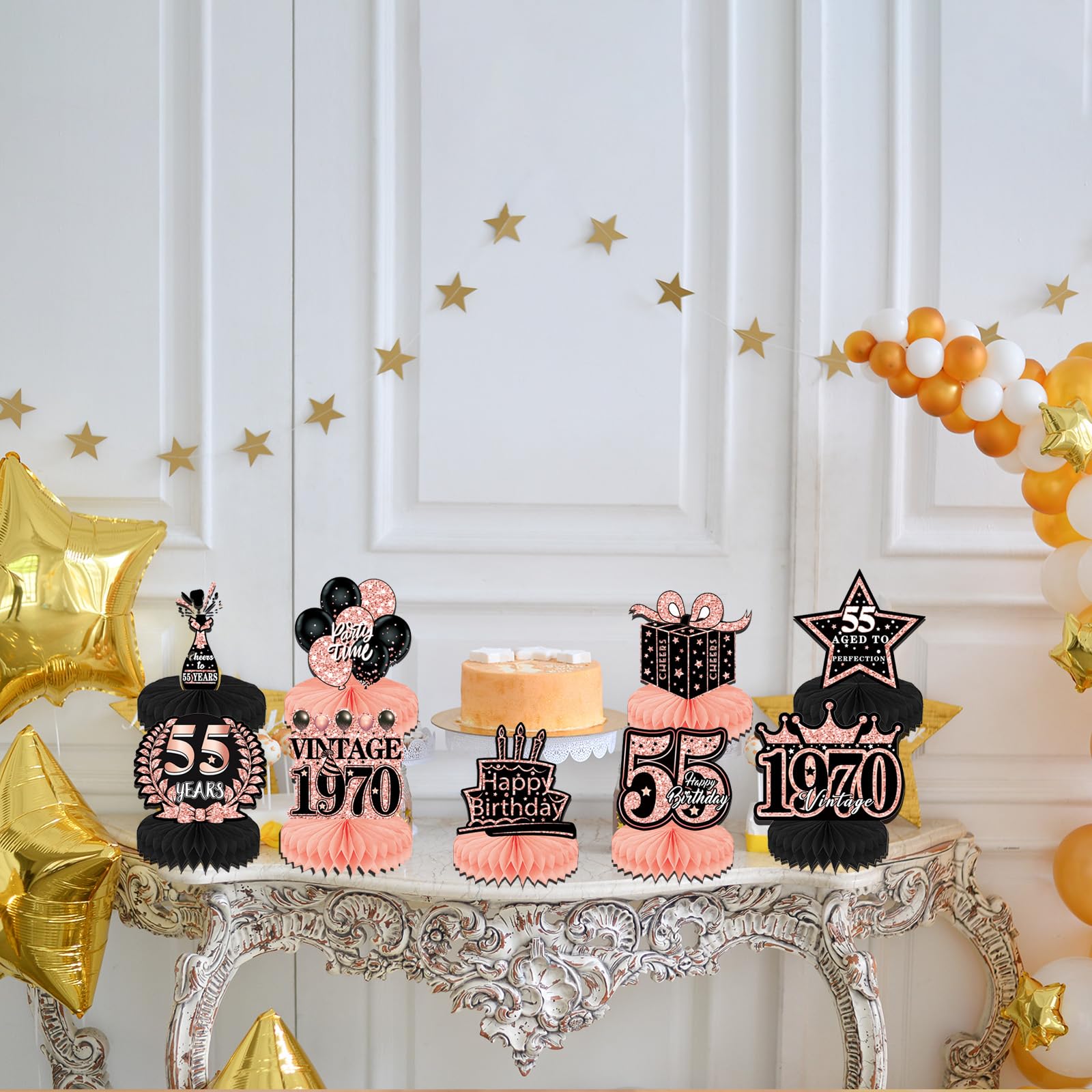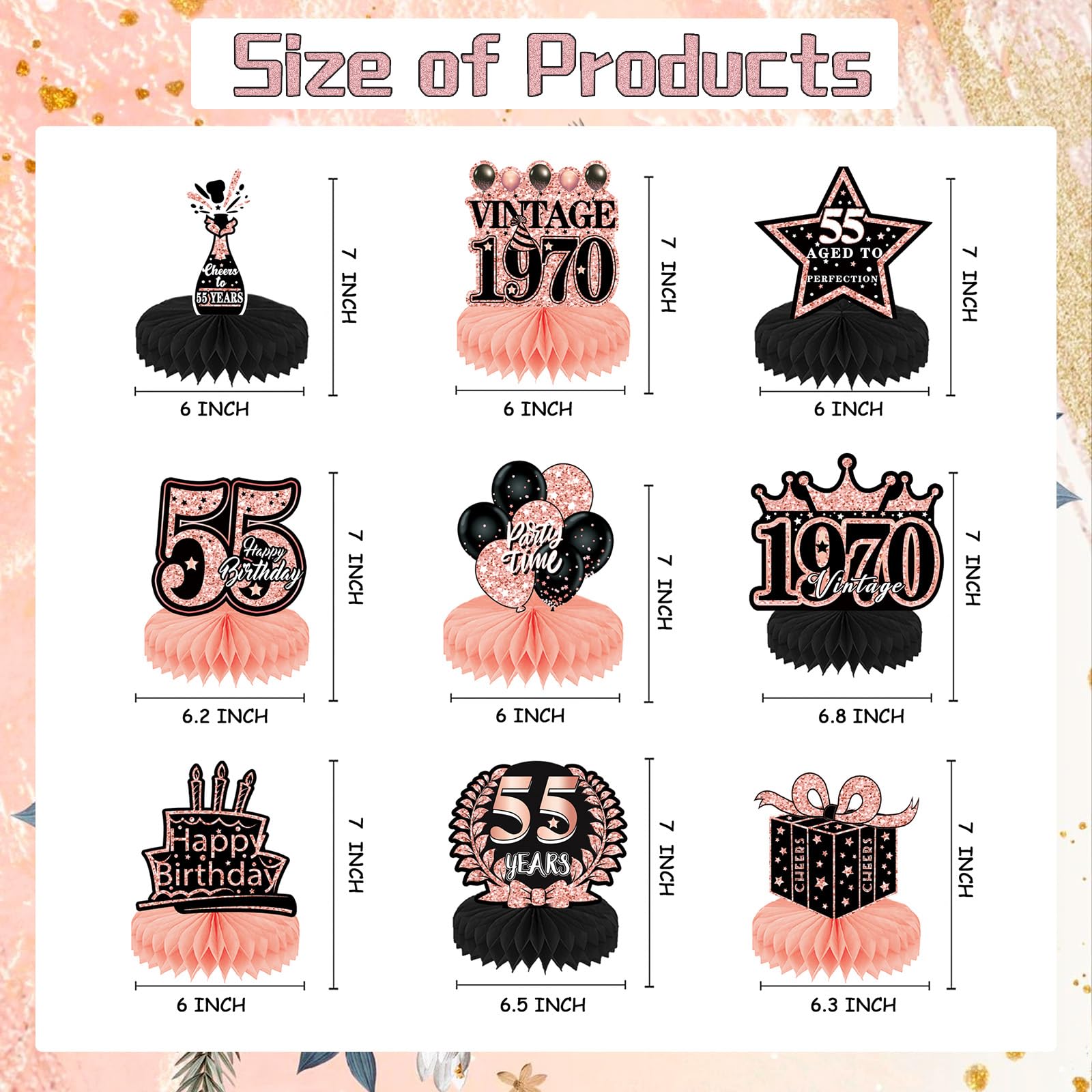 55th Birthday Decorations: You will receive 9pcs honeycomb table decorations. With exclusive "happy birthday" "55" graphic designs, 4 pink honeycomb bases and 5 honeycomb black bases.