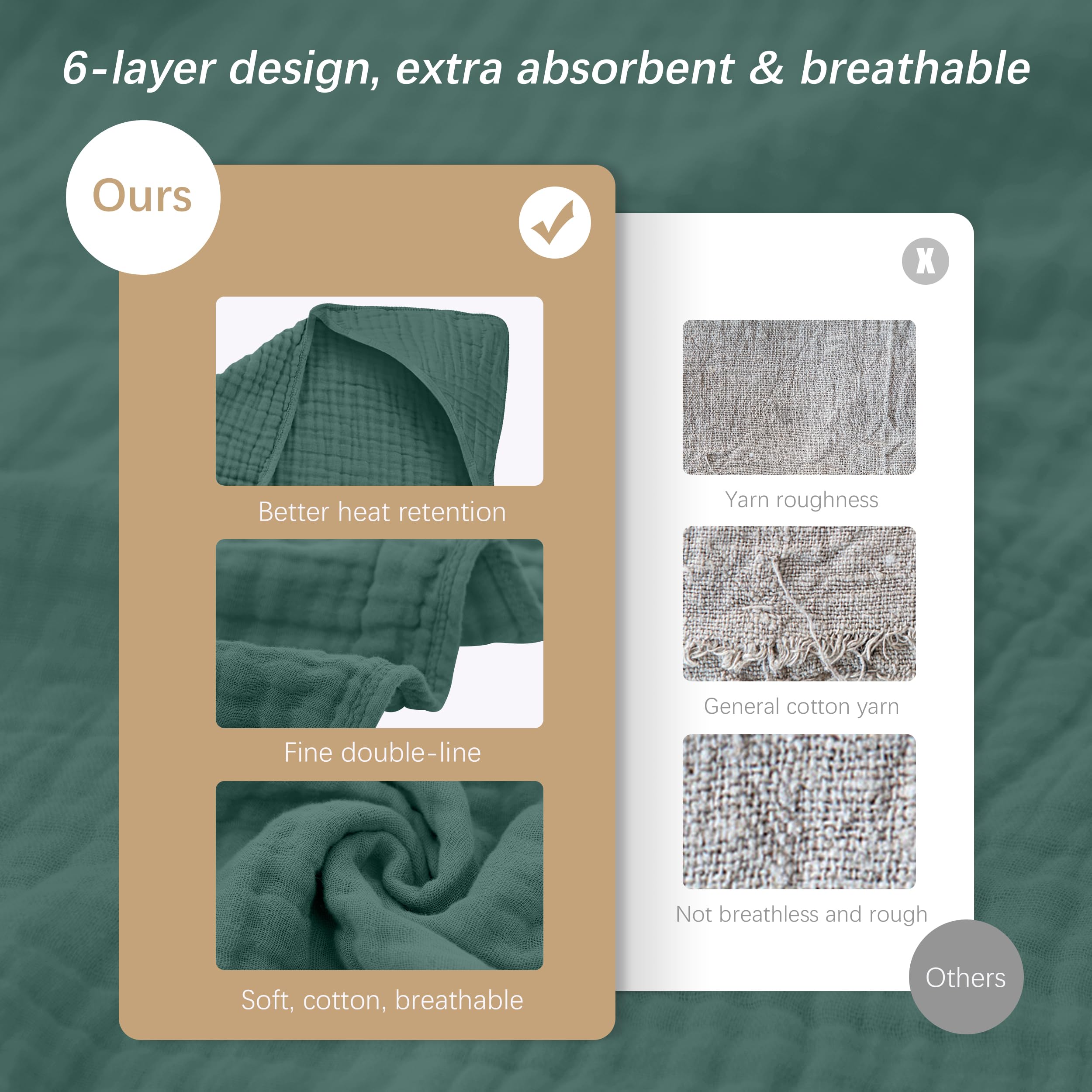 Exceptional Durability: Designed with your little one's needs in mind, our hooded baby towels feature a robust 6-layer muslin construction. This ensures they stand up to daily use, offering unparalleled quality and durability. Generously sized at 32 x 32 inches, they're perfect for newborns, infants, toddlers, and children up to 3 years old, ensuring your child remains snug and warm from infancy through their toddler years.