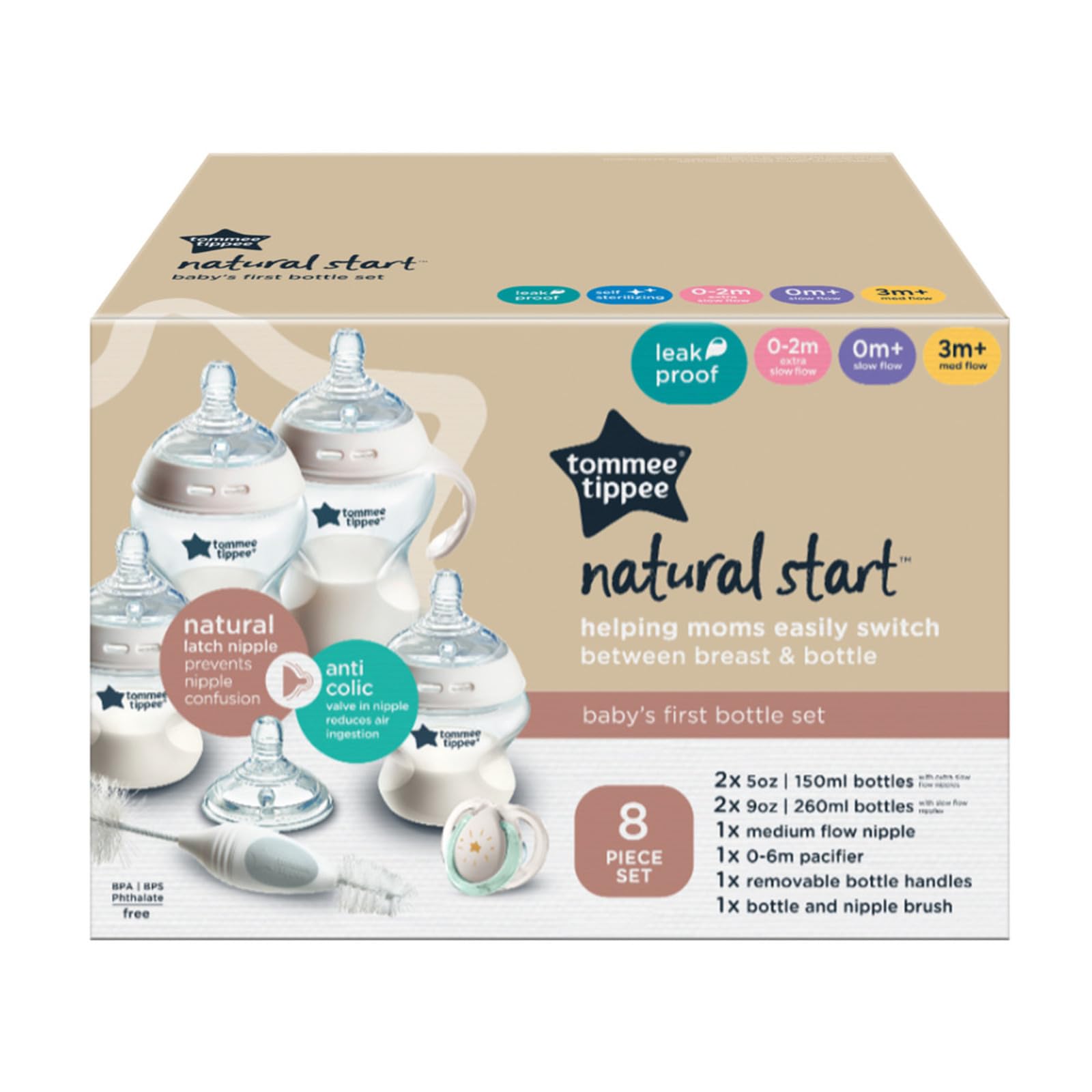 What's Included: 2 x 5oz and 2 x 9oz anti colic BPA free bottles, 2 x extra slow and medium flow nipples, and 2 x 0-6 month pacifiers