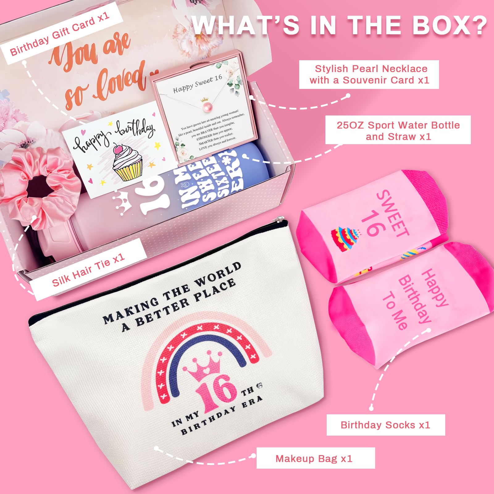 【7 Pieces Unique 16th Birthday Wishlist Gifts 】7 Beautifully packaged gifts 1 x 25 oz tumbler, 1 x stylish pearl necklace with a souvenir card, 1 x double-sided printed cosmetic bag, 1 x fancy birthday socks, 1 x hair tie, 1 x birthday card(Write your blessings), 1 x gift box. Receiving this gift box set, she will feel extremely happy and cherished, as if she has an exclusive luck and blessing