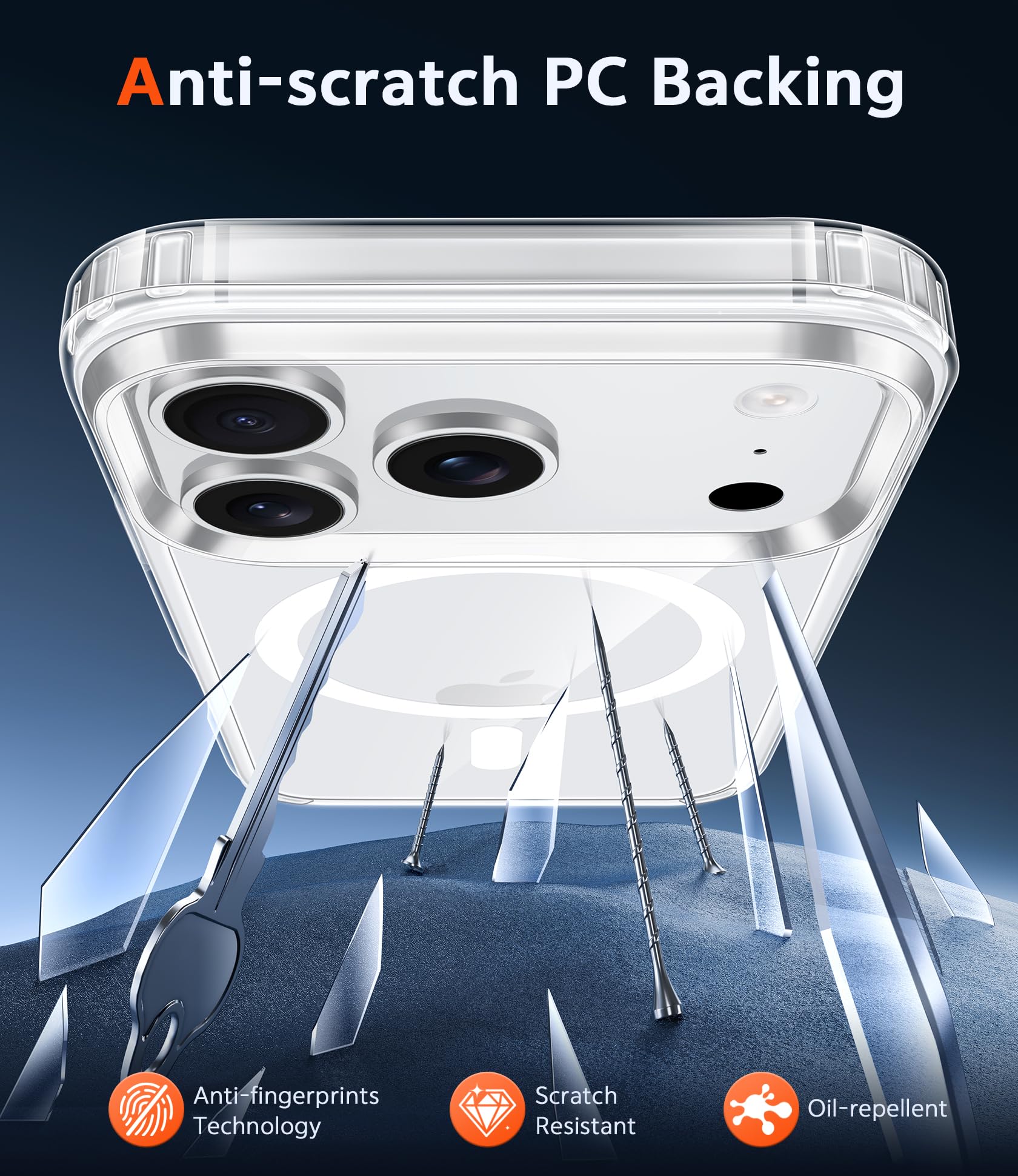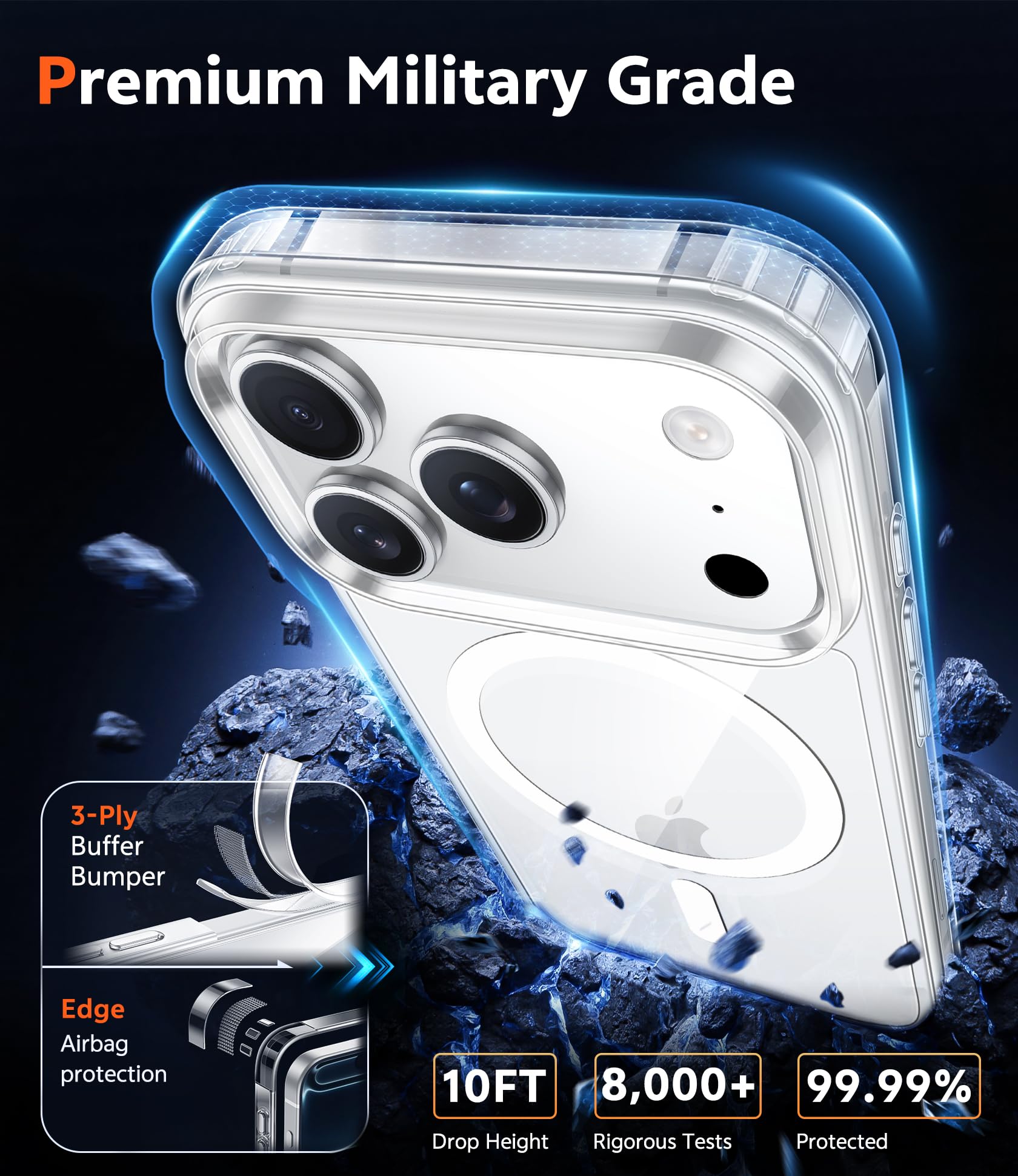 10FT Military Grade Protection: Passed Military Drop Tested up to 10 FT. This clear iPhone 17 Pro Max case backplane is made with rigid polycarbonate and flexible shockproof TPU bumpers around the edge and features 4 built-in corner Airbags to absorb impact
