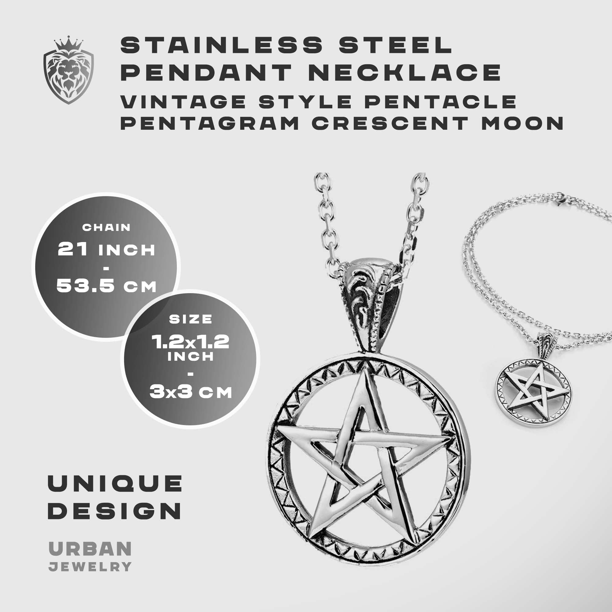Description Getting the look of an aged heirloom pentagram necklace doesn't have to mean spending a fortune for an antique! The Urban Jewelry Vintage Style Pentacle Pentagram Crescent Moon Stainless Steel Pendant Necklace for Men looks like a necklace that has been handed down through the ages but is brand new and made from the finest quality non tarnishing stainless steel. Measuring 1.34 inches in diameter by 1.5 inch in thickness, the Urban Jewelry Vintage Style Pentacle Pentagram Crescent Moon Stainless Steel Pendant Necklace for Men presents two important symbols from many religious faiths. The crescent moon in the center has long been revered as a symbol of the harvest and is symbolic over the triumph over death in the Islamic faith. The pentagram is the embodiment of all five elements: earth, wind, water, fire and ether, which represents the spirit. Sold with a 21-inch stainless steel chain, the Urban Jewelry Vintage Style Pentacle Pentagram Crescent Moon Stainless Steel Pendant Necklace for Men arrives ready to wear in a stylish gift box. The necklace makes a very unique gift of faith for men for any occasion. Treat yourself or a special gentleman to the beauty of a vintage inspired necklace! Order the Urban Jewelry Vintage Style Pentacle Pentagram Crescent Moon Stainless Steel Pendant Necklace for Men today.