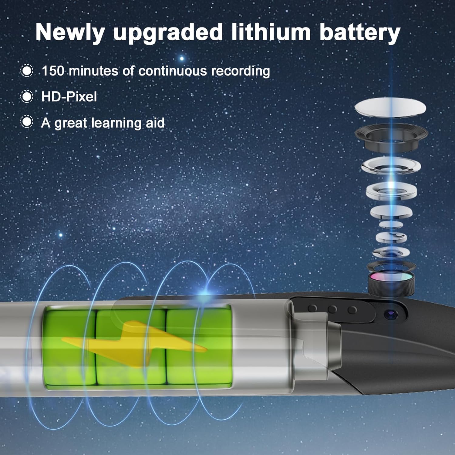 【Long-lasting battery life】The built-in 360 mAh lithium battery can record continuously for approximately 150 minutes. Standby time can last up to five hours.