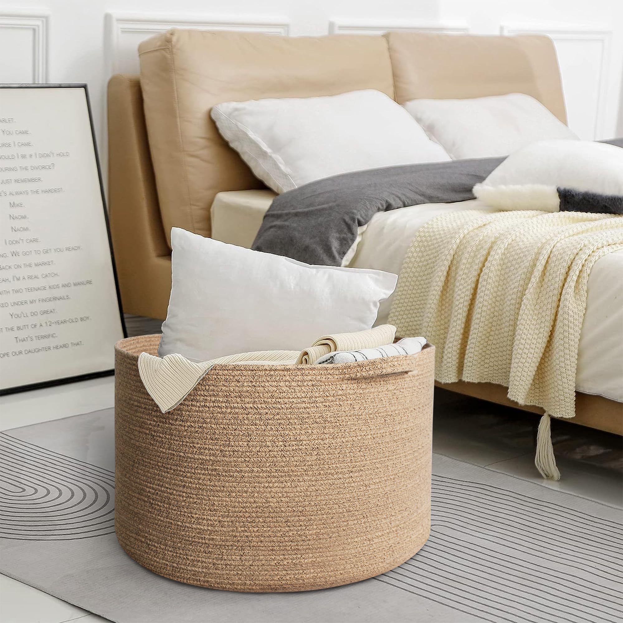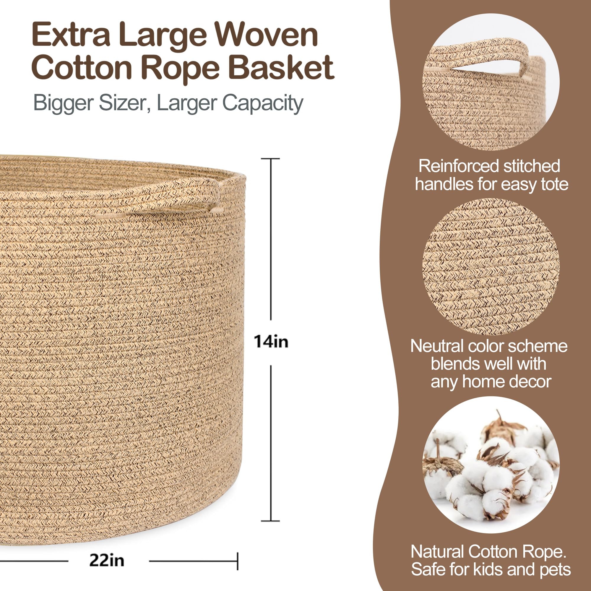 SOFT COTTON ROPE BASKET: The brown basket is braided from natural cotton rope, making it a super soft but sturdy, textured bin. The rope basket for storage is huge and doesn't have a smell at all. Woven rope baskets with no hard edges are safe for your kids allowing them to climb into these wick basket and won't scratches or damage the floors.