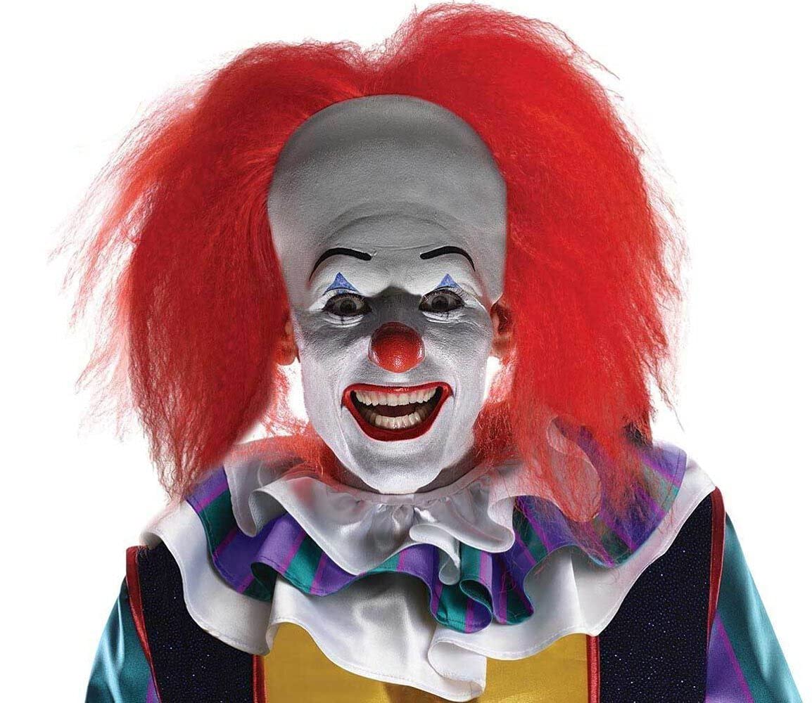 Based on Stephen King's IT, this monstrous clown costume includes a colorful jumpsuit, white gloves, and a mask complete with razor sharp teeth, a devilish grin, and a wild mane of fiery red hair.