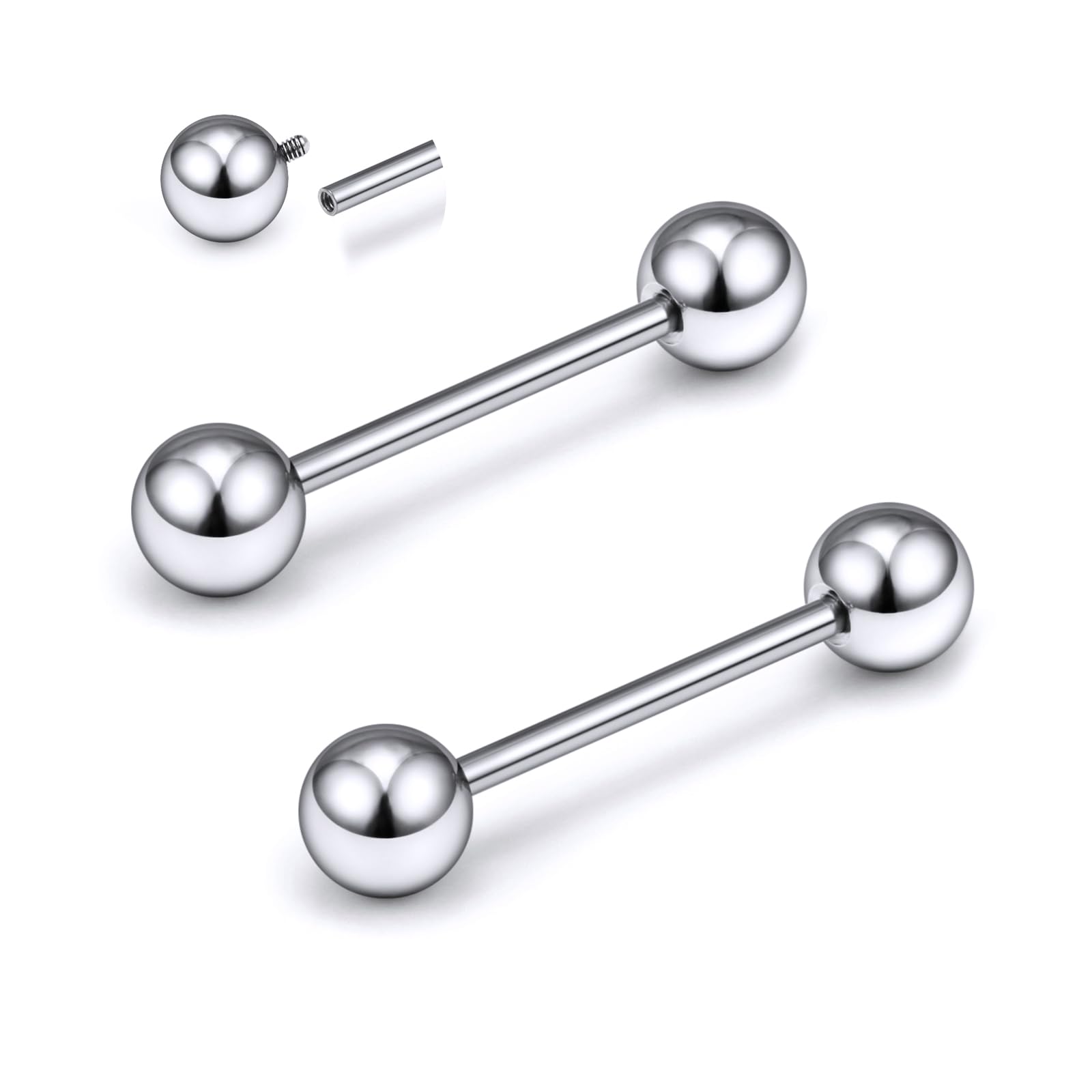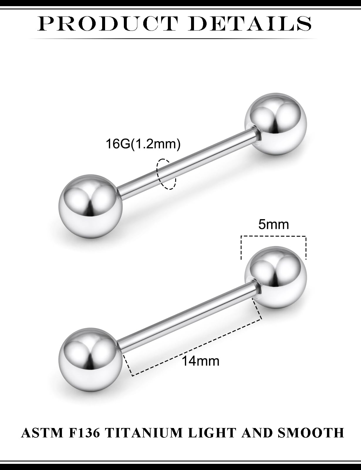 【Perfect size】: Straight barbell nipple tongue rings piercing jewelry gauge: 16G(1.2mm), bar length: 9/16 inch(14mm), top ball size: 5mm, color: silver