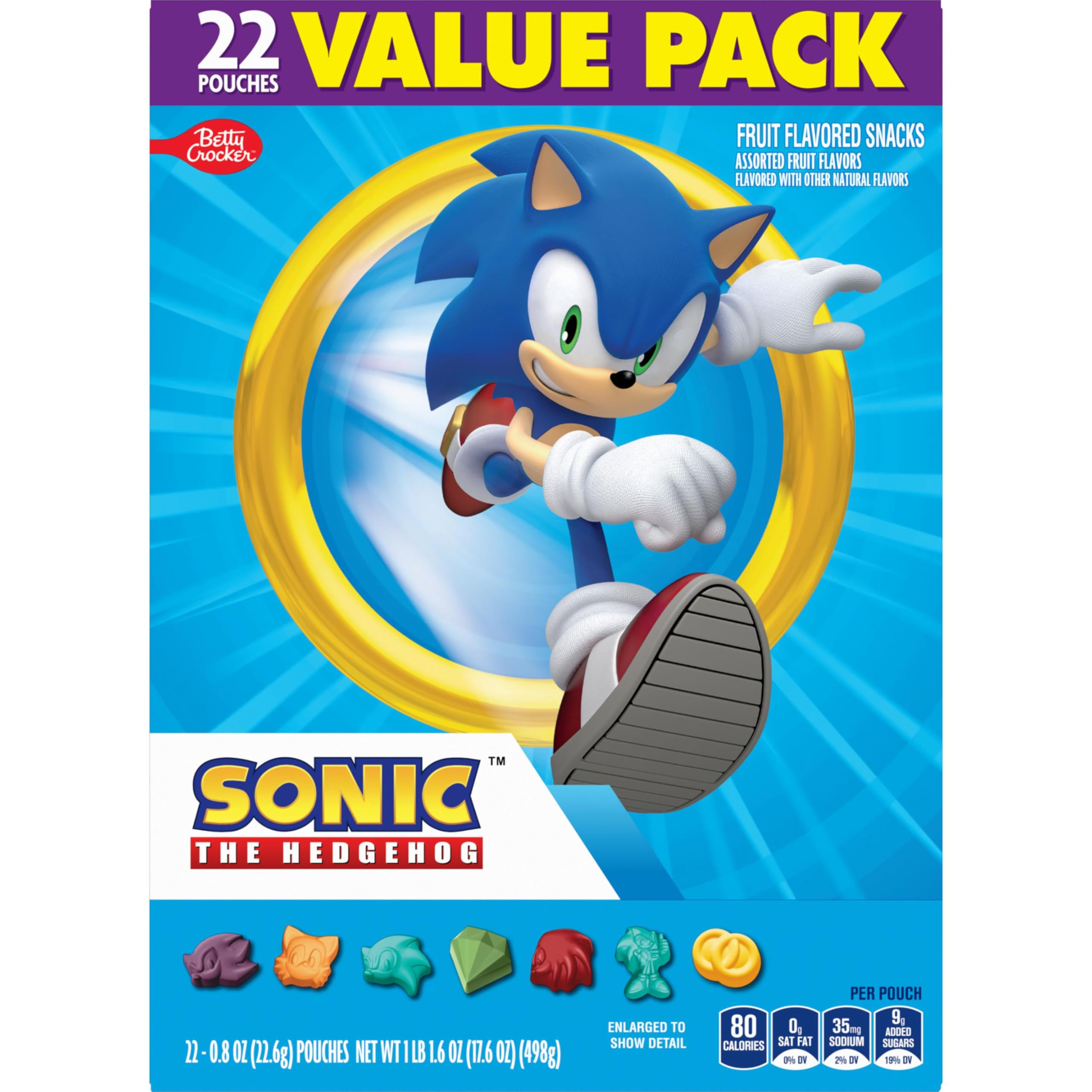 CONTAINS: One 17.6 oz Value Pack cardboard box of chewy Sonic The Hedgehog Fruit Flavored Snacks; 22 pouches