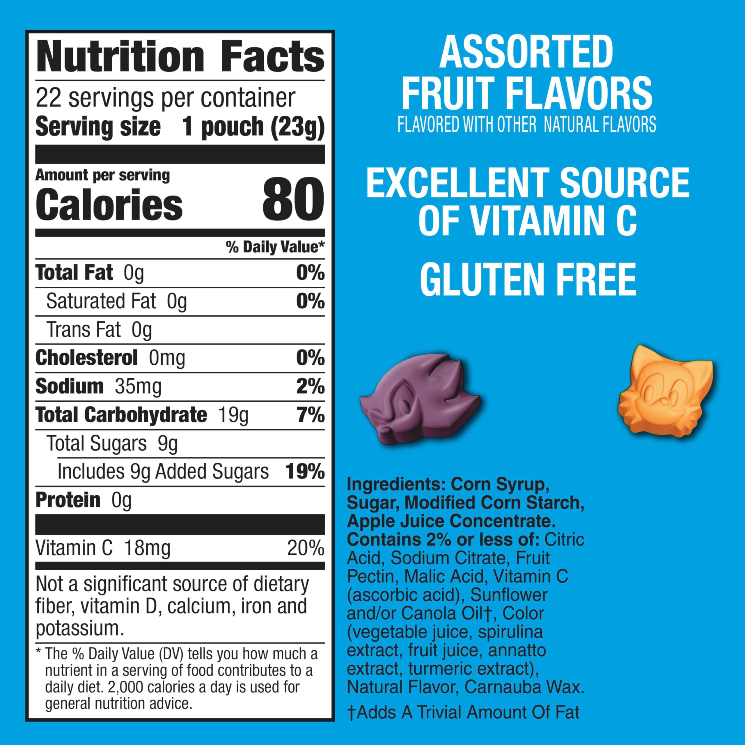 Sonic The Hedgehog Fruit Flavored Snacks feature tasty treats shaped like your favorite Sonic characters for maximum fun. Packaged for on the go convenience and portability, these fruit flavored snacks are a treat the whole family can enjoy. These packaged snack bags are the perfect treat to include in a packed school lunch box or keep on hand for a moment's notice. You've found the perfect after school snack that's a win for you and your kids. Sonic Fruit Flavored Snacks are an ideal addition to your pantry and grocery routine. Beyond the yummy taste, these treats are made without colors from artificial sources. They're an excellent source of vitamin C, gluten free, and fat free, with 80 calories per serving. Contains one 17.6 oz Value Pack cardboard box of chewy Sonic The Hedgehog Fruit Flavored Snacks; 22 pouches.