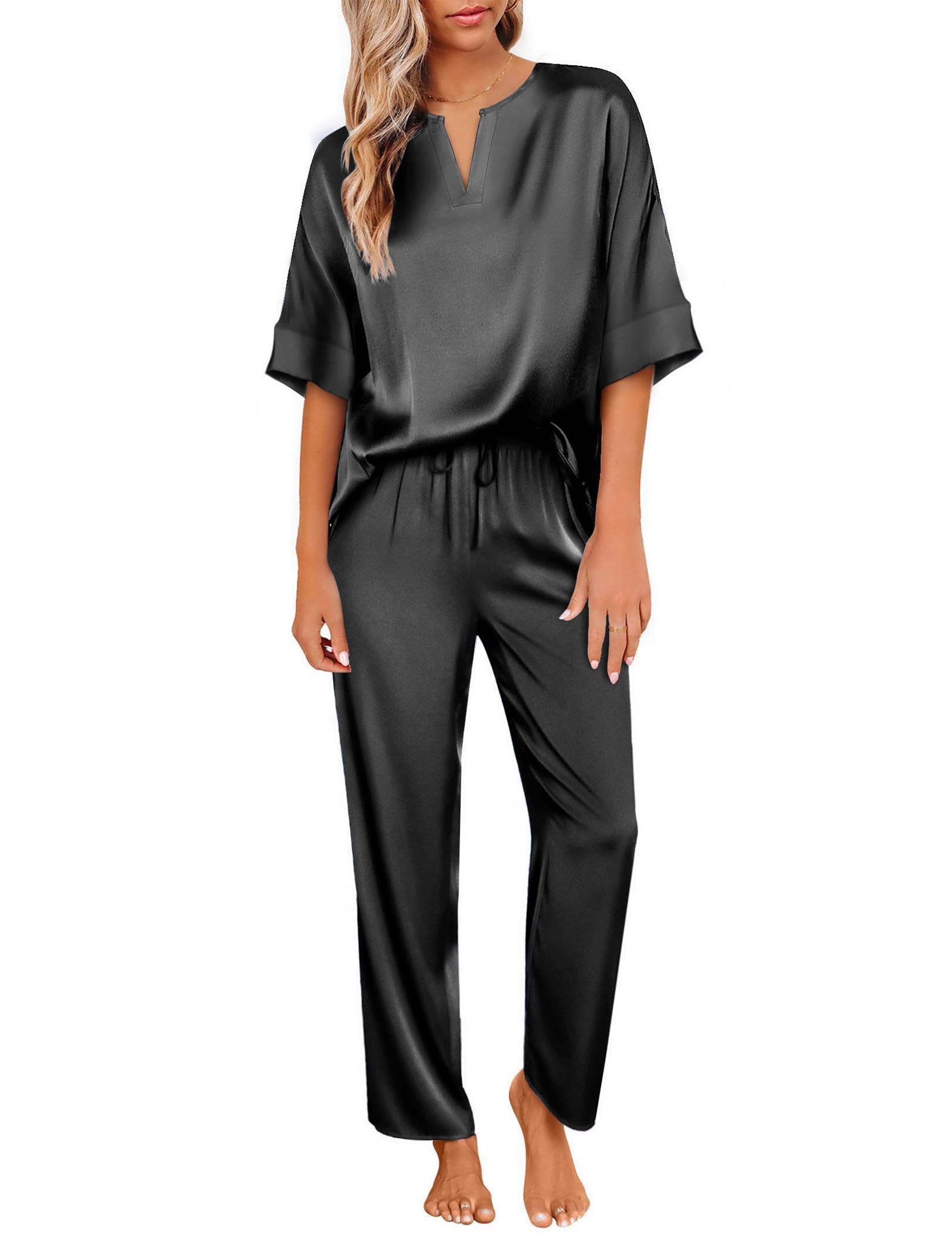 A lightweight two-piece pajama set featuring a pullover tee top and long pants. Soft satin silky fabric, comfy to wear.