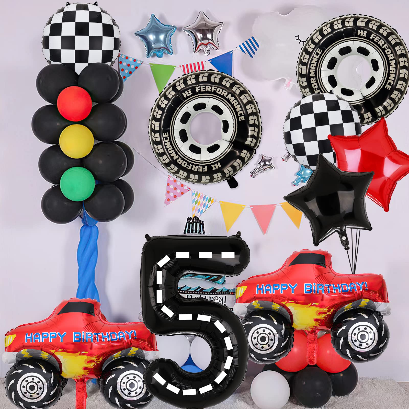 Package Included: 2PCS Giant Size Truck Foil Balloon, 2 pcs tire wheel balloon,2pcs Round Racing Foil Balloons, 18’’ Red and Black Star Balloons, 1PCS 40’’ 4 Number.Totally 9PCS. Perfect for a Truck Racing Car Theme Party.
