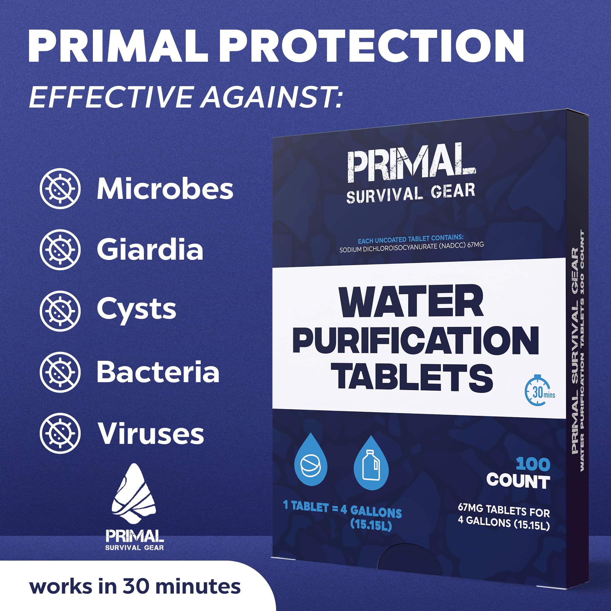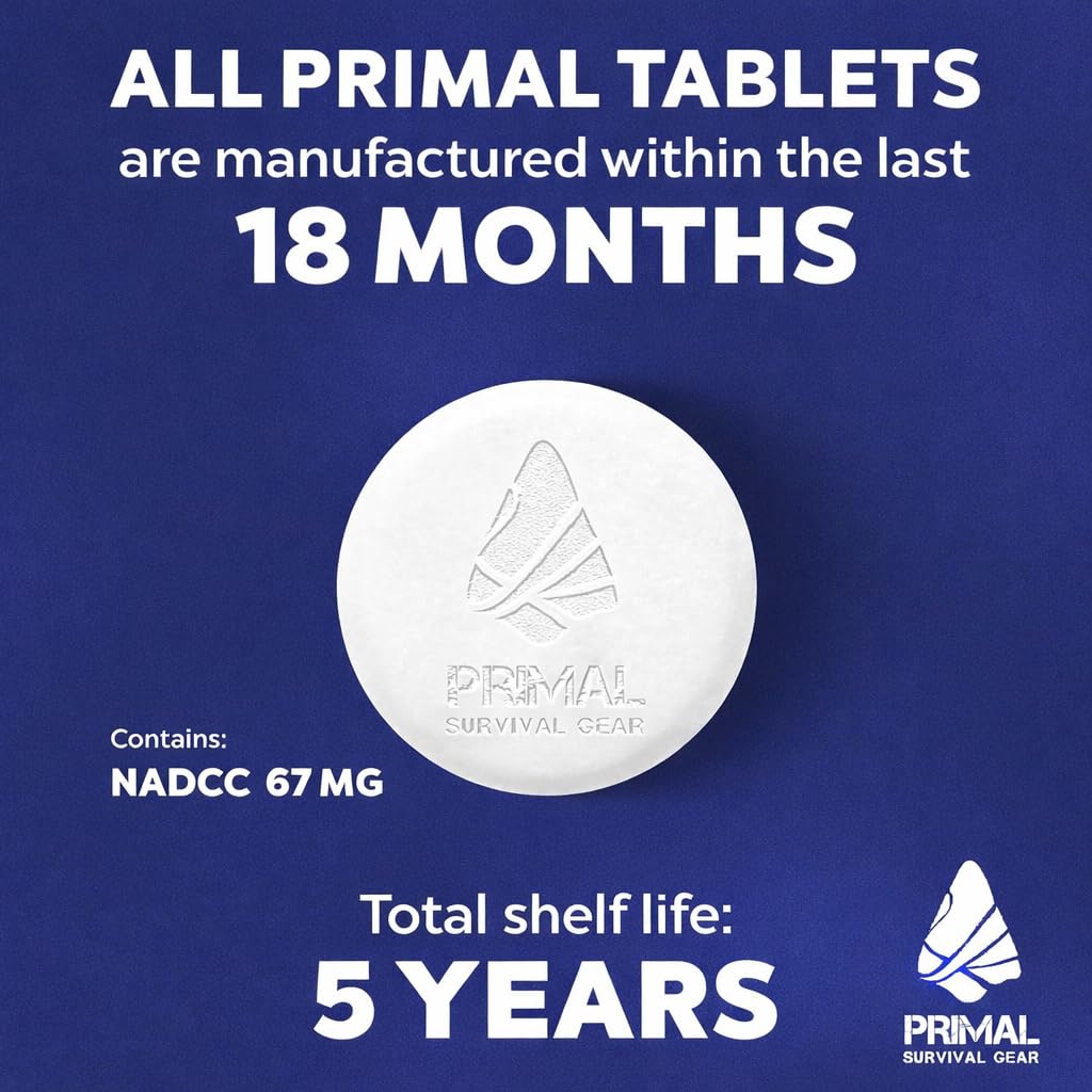 Primal Freshness - 100 Tablets: Our sodium dichloroisocyanurate (NADCC) water purification tablets are always manufactured within the last 12 months, ensuring maximum potency with a shelf life of 5 years – providing peace of mind for all situations.