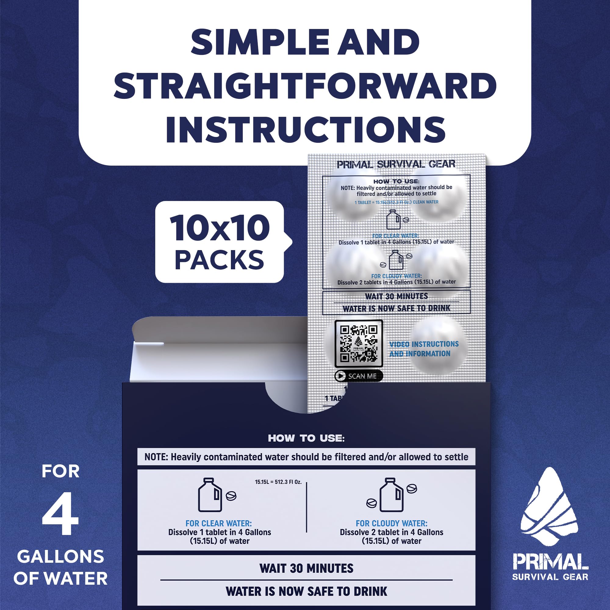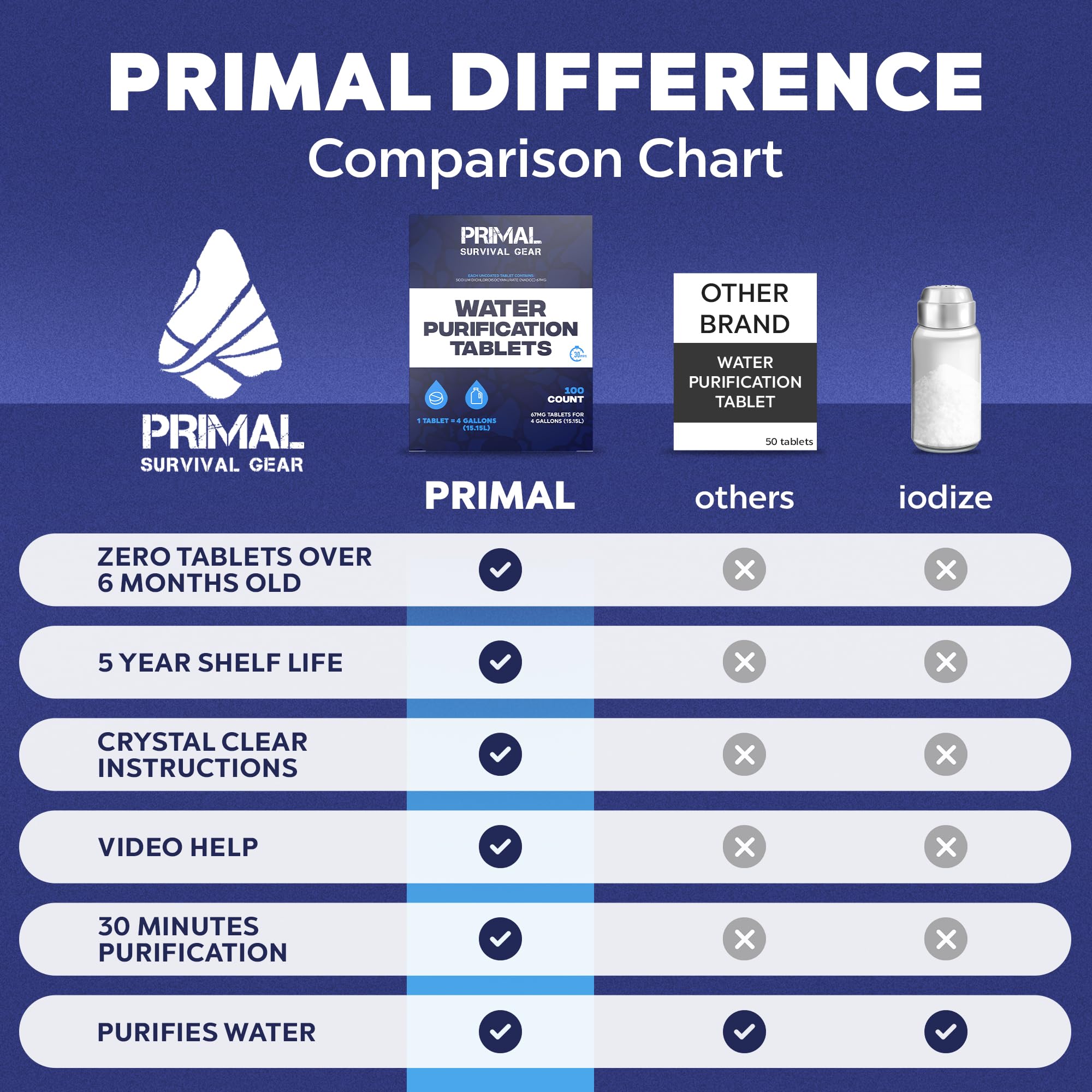 Primal Survival Gear water purification tablets are specifically designed with you in mind. We have consciously designed clear, easy-to-read, straightforward instructions so that in any survival situation, you will know what to do. We have also provided Easy-To-Scan QR codes so you can watch a short video that demonstrates EXACTLY how to use our tablets and how much water each one purifies. No more guessing. While others send in excess stock that has been on the shelves for years, we ship and sell directly to you, our customer. Other tablets are commonly expired, or close to expiration, from being sent in after they did not sell in other areas of the world. Meaning you, the customer is getting an old product, near the end of its life, or even worse.... Expired. Our main focus is reliability and consistency. That is why we pride ourselves on not selling any tablets that are over 6 months old. We provide you with the freshest tablets that have the longest shelf life at 5 years. Stop second guessing and take control of your survival.