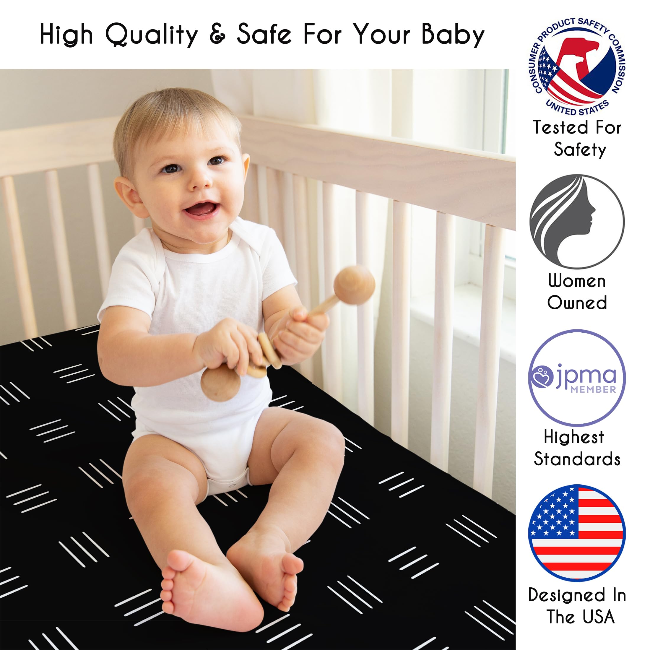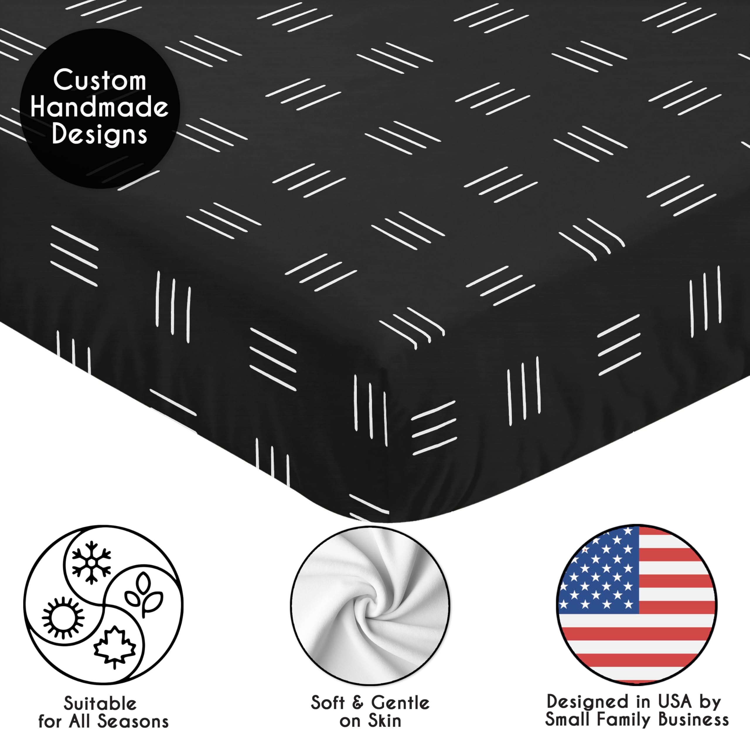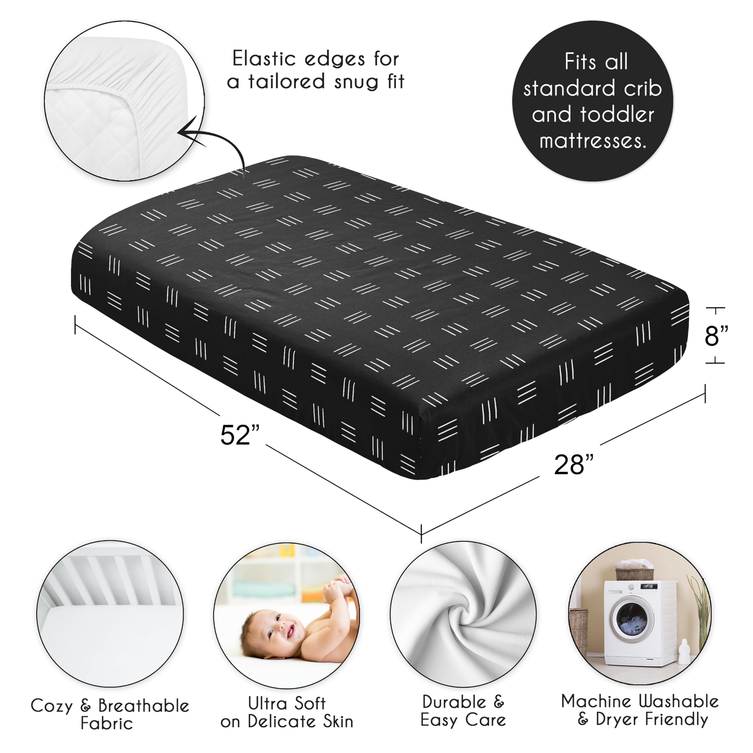 SNUG FIT: Includes (1) Fitted Crib Sheet 52in. x 28in. x 8in. Our newborn standard crib sheets fit snugly, with premium elastic sewn around the entire bottom edge for a secure fit on most standard sized cribs and toddler beds, to reduce shifting & bunching. This brushed microfiber crib sheet features an exclusive design of a black & white bohemian, woodland, mudcloth, tribal, southwest, triple line, boho mud cloth hatch print & is gentle on delicate skin to foster a soothing sleep environment.