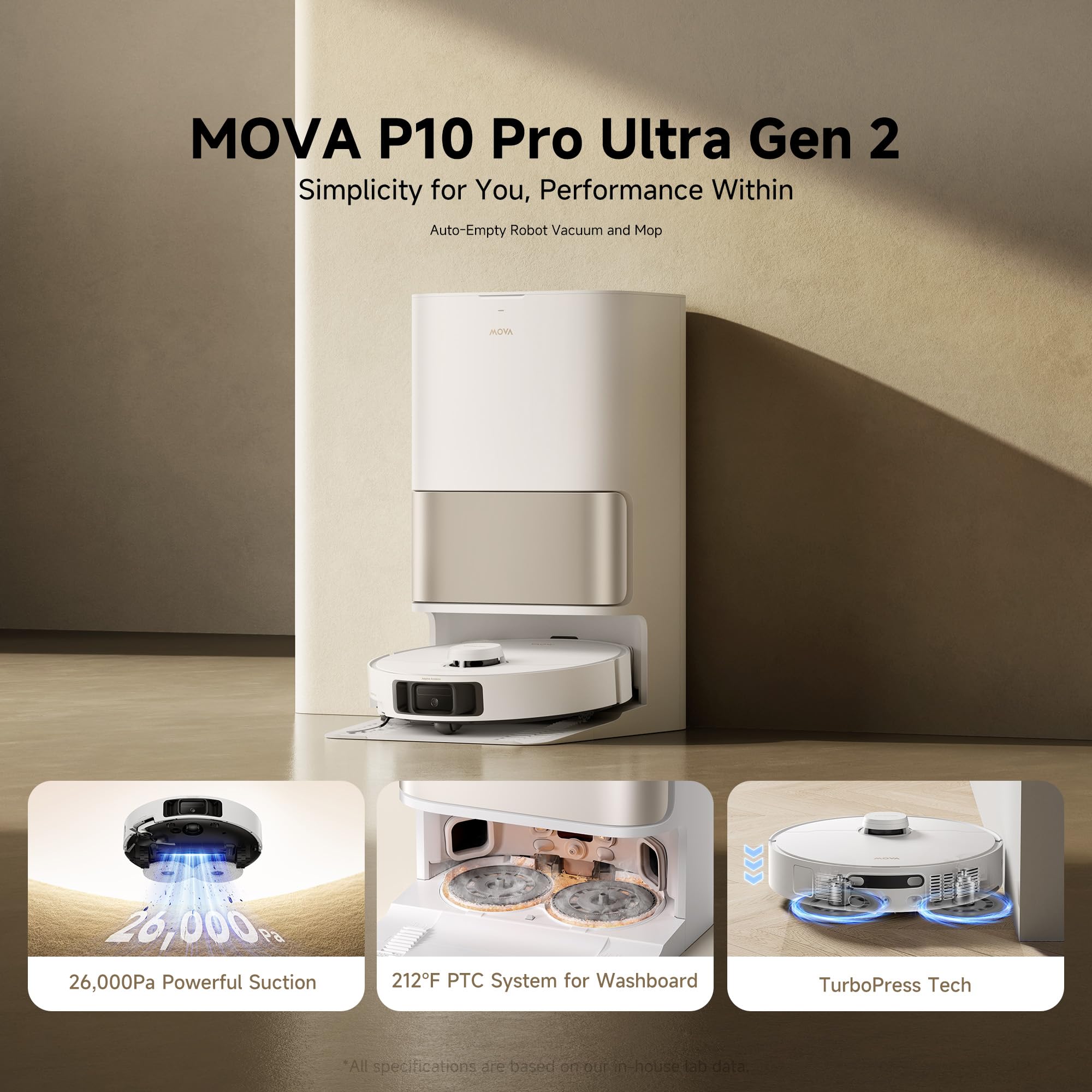 26,000Pa Powerful Suction for Deep Cleaning: Powered by a high-speed motor, MOVA P10 Pro Ultra Gen2 delivers 26,000Pa strong suction—easily capturing large debris, pet hair, and fine dust from hard floors, floor gaps, and long-pile carpets. This robot vacuum cleaner provides powerful, low-noise performance for whole-home deep cleaning.