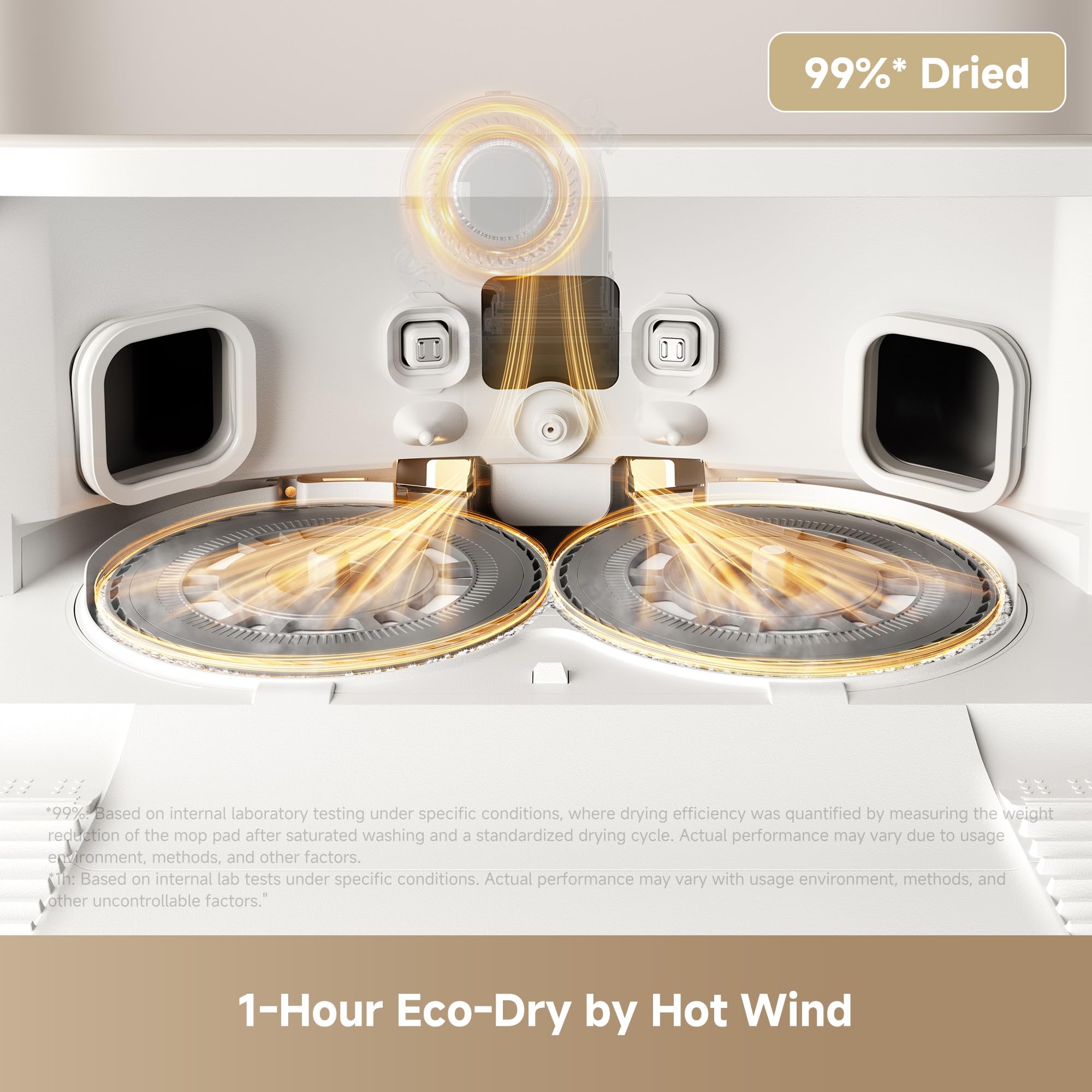 1-Hour Hot Air Mop Drying, Odor-Free: After mopping, hot air dries the pads up to 99% within 1 hour. This hands-free robot vacuum and mop system prevents odor, moisture buildup—keeping mop pads fresh and ready for the next automated clean.