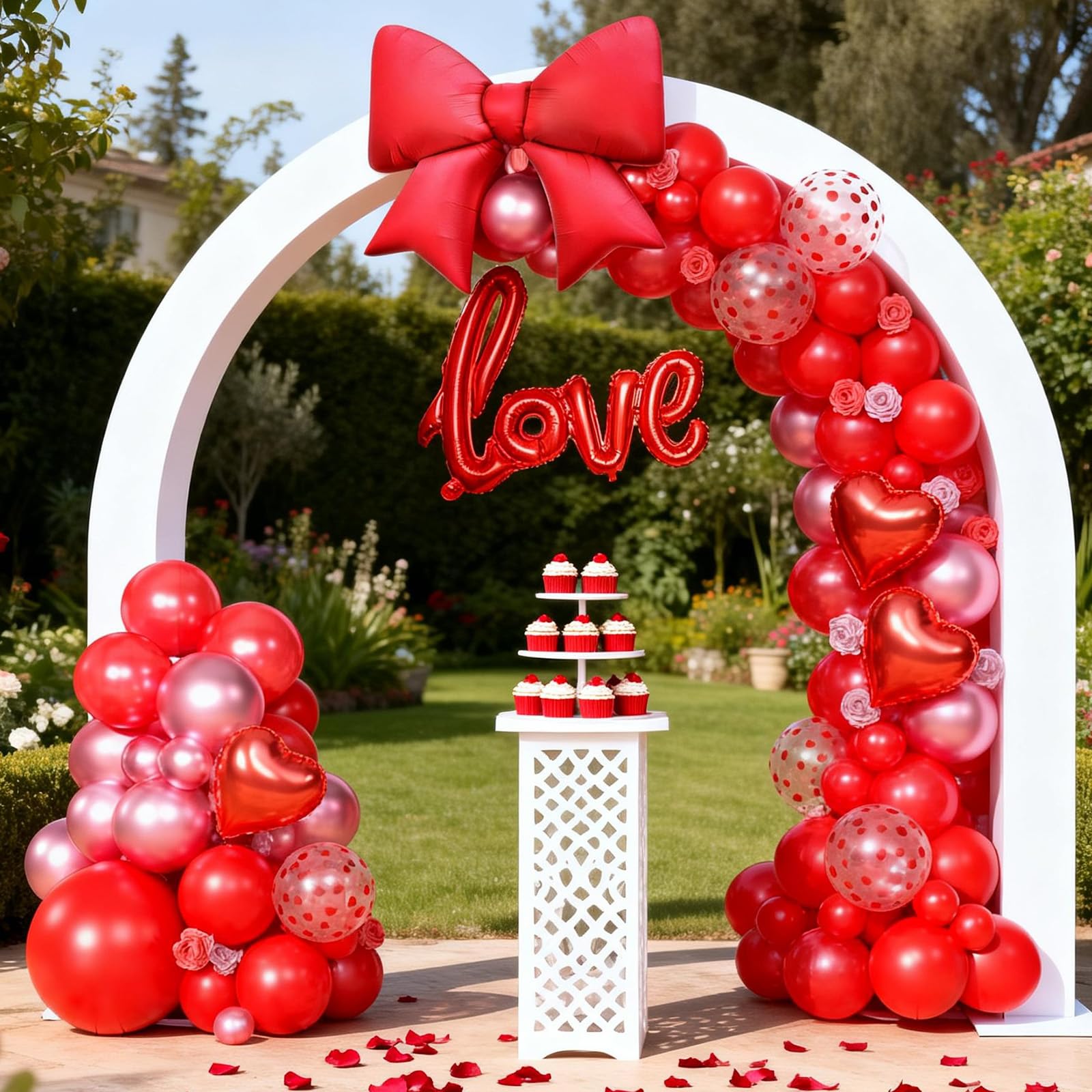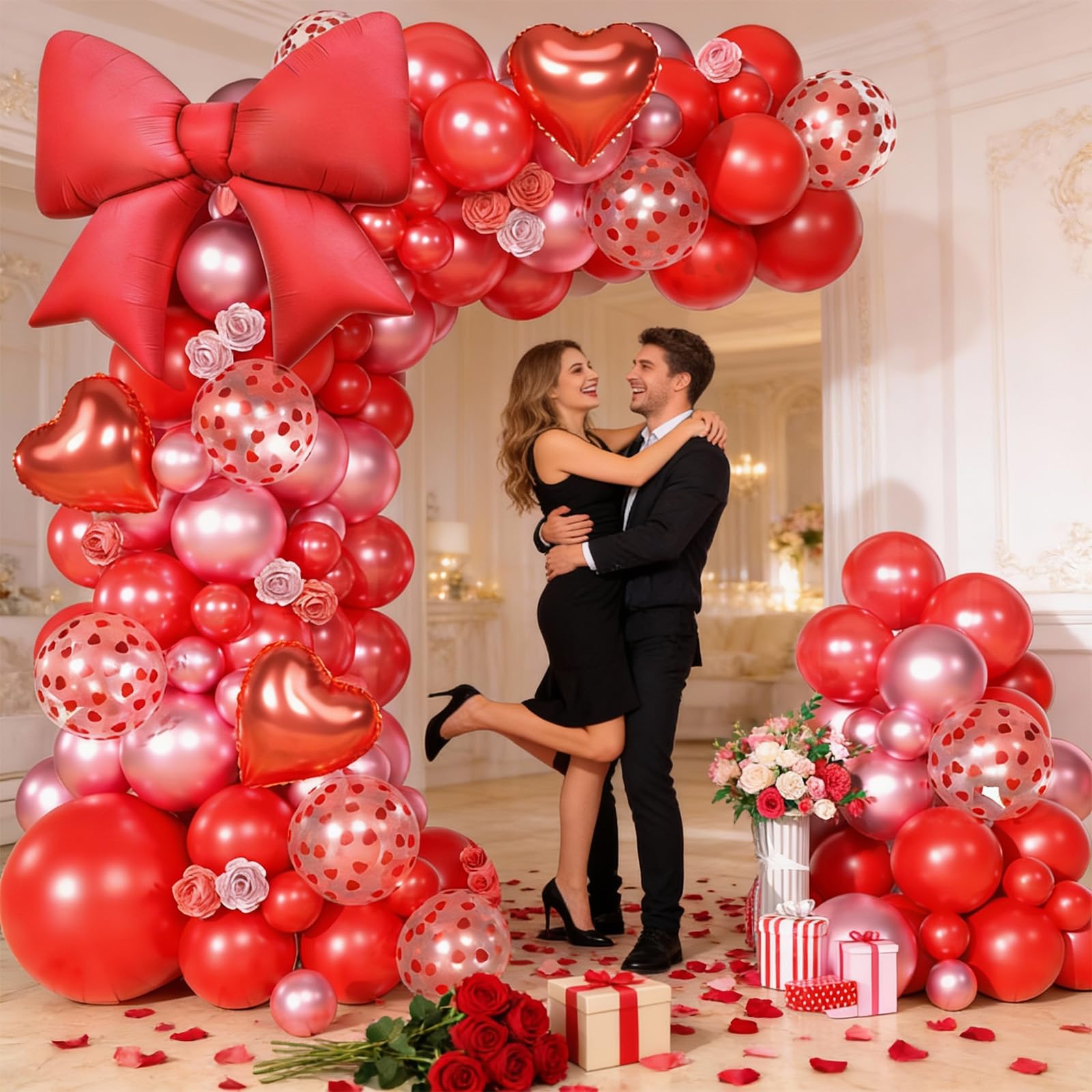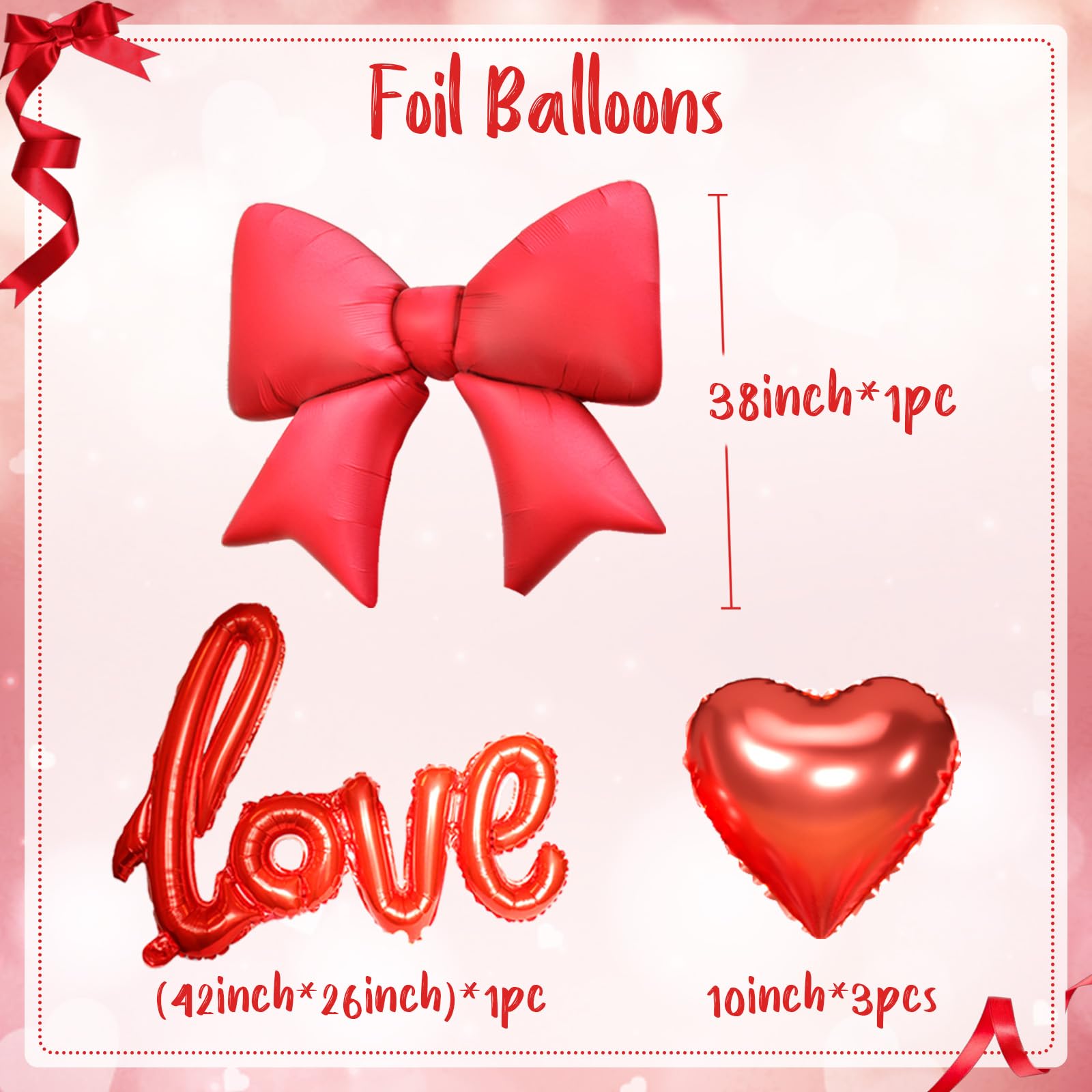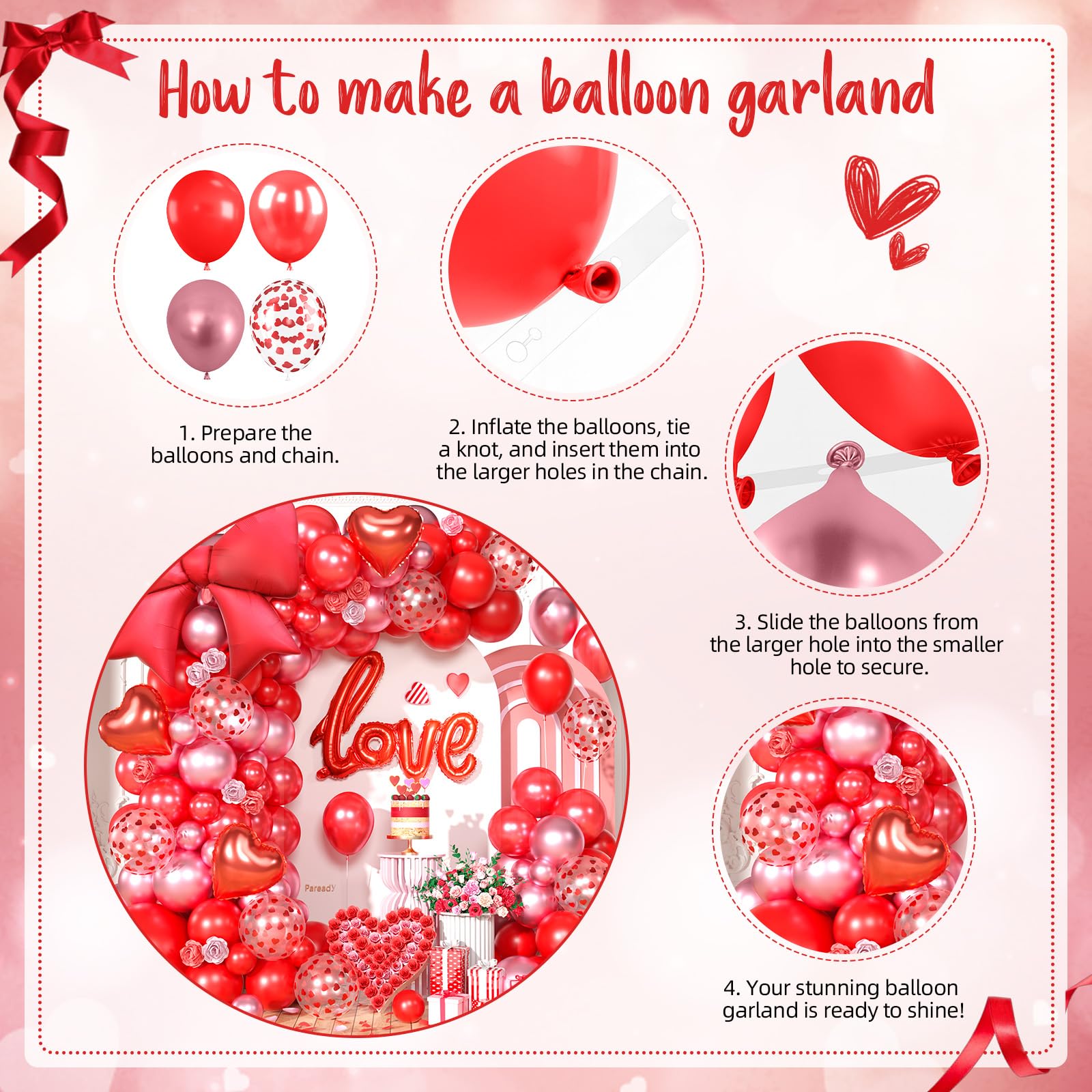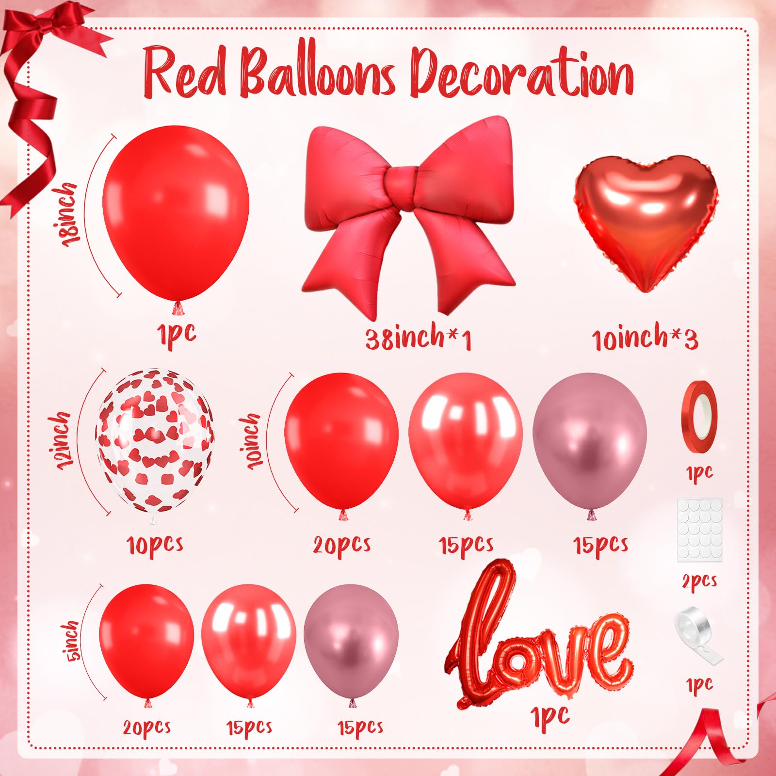 Package Contents: This red balloons arch garland includes 1pc 18inch red balloon, 50pcs 10inch balloons (matte red, pearl red, metallic red), 10pcs 12inch red heart confetti balloons, 30pcs 5inch balloons (matte red, pearl red, metallic red), 3pcs 10inch red heart foil balloons, 1pc red love foil balloon, 1 x red ribbon, 2 x dispensing dots, and 1 x 5m balloon chain.