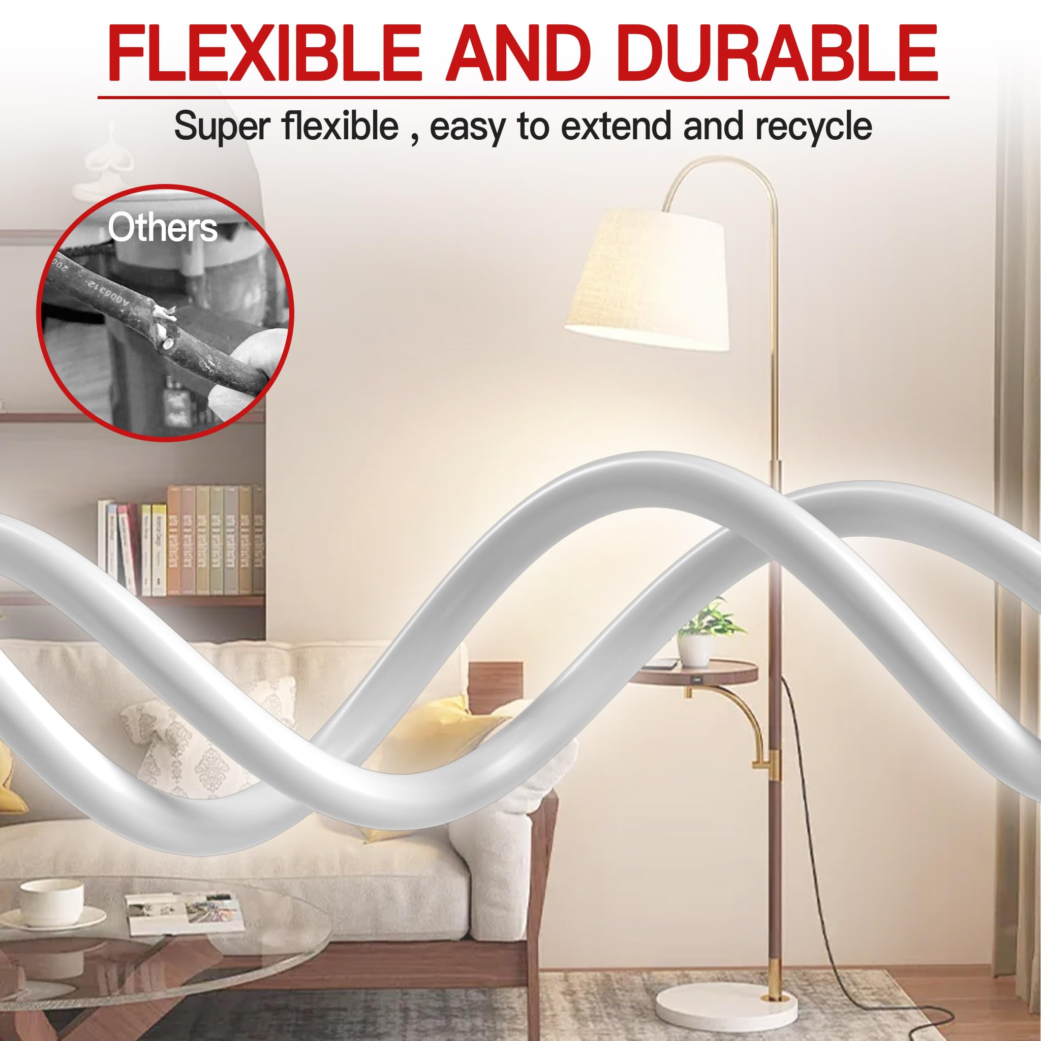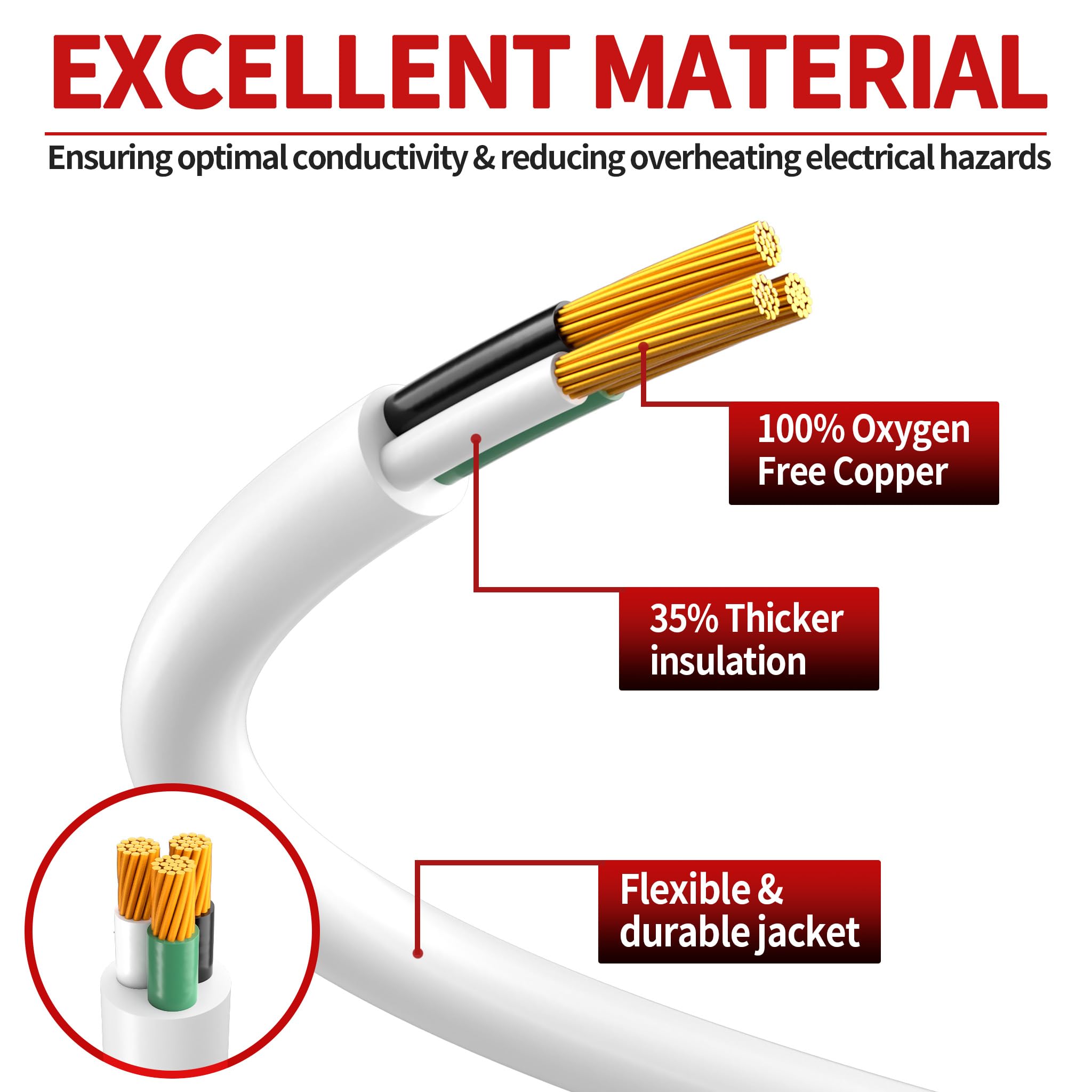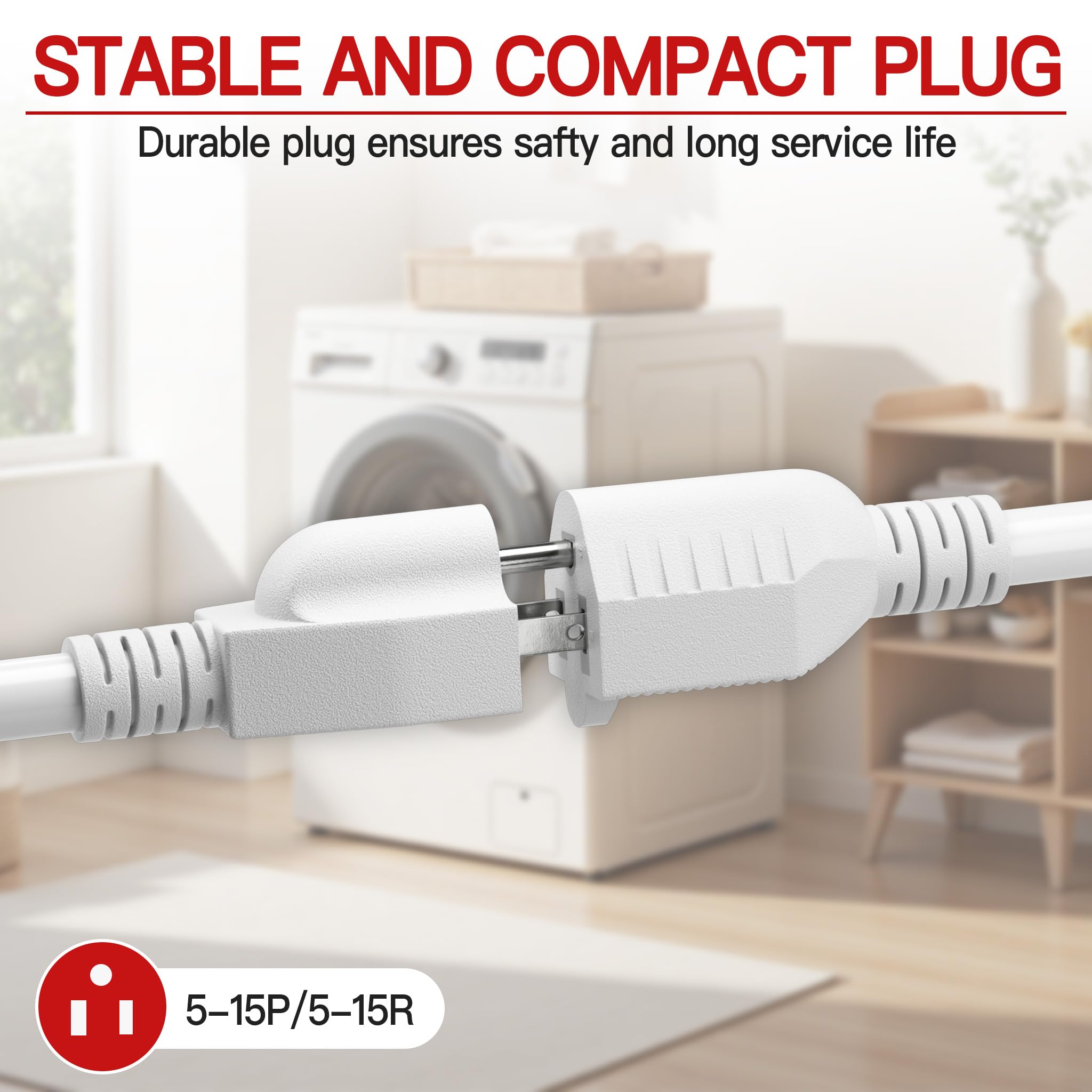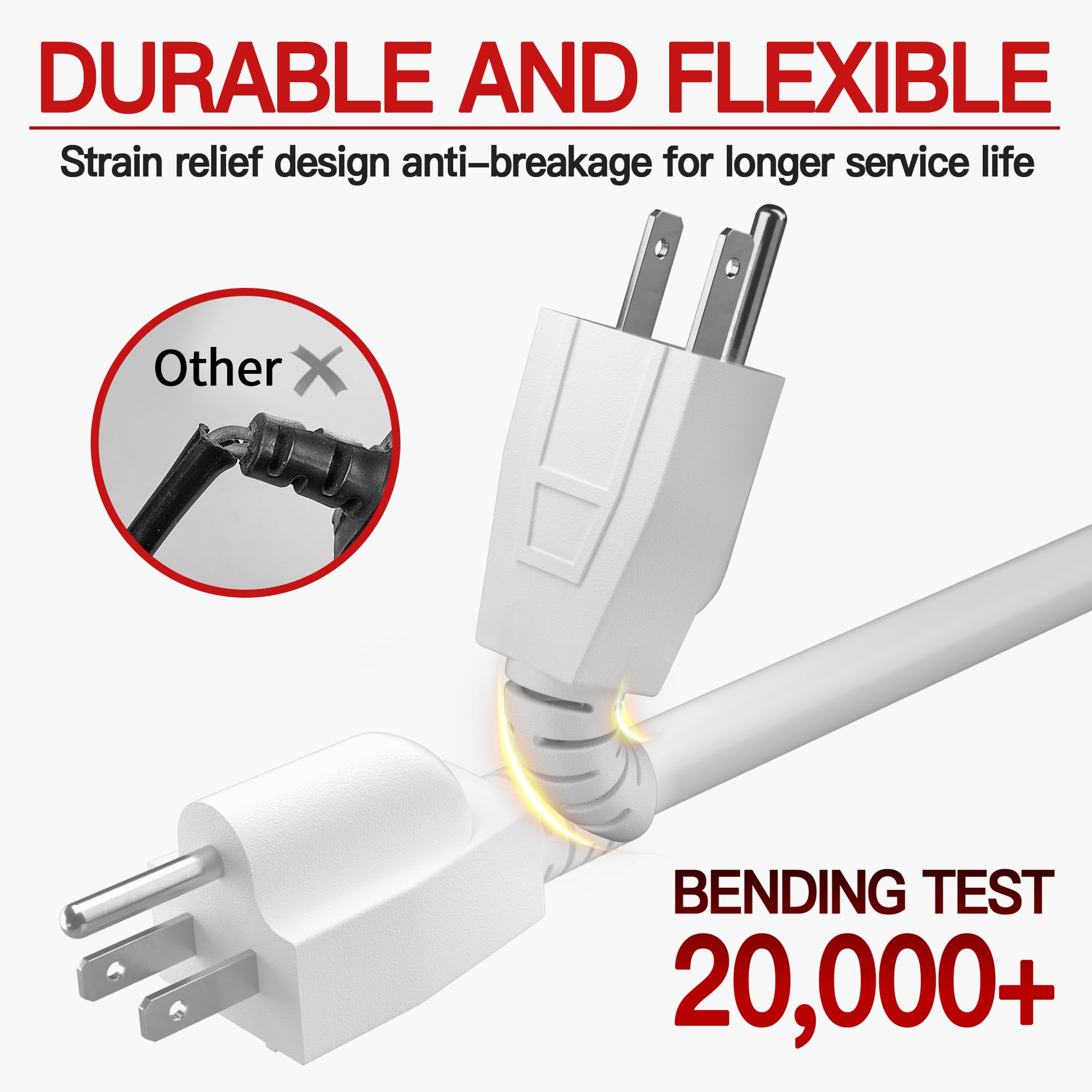 Flexible & Tangle Resistant: 6ft 2 pack extension cord Plug and socket are designed with long strain relief at the end; White extension cord 6ft pass 20,000 large-angle bends without breaking prolonging service life; Small extension cord provides flexible mobility for small appliances and sockets after use it can be easily stored to avoid clutter