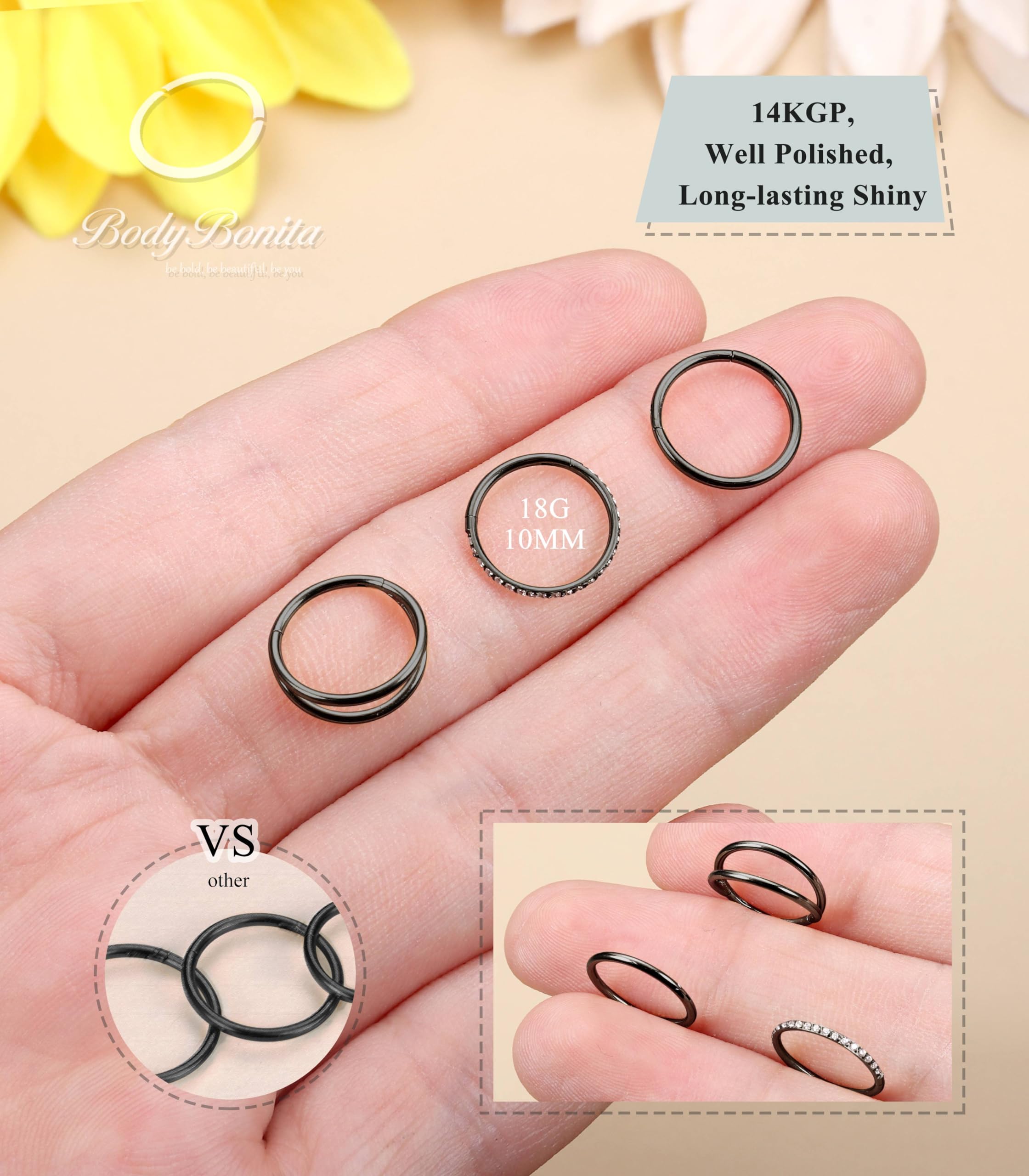 Seamless Black Plated Nose Ring Hoop: Gauge size: 18G(1.0mm); Inner diameter: 10mm(0.39 inches); Material: 316L stainless steel; One order includes 3 pieces of hinged segment ring, come in various styles to meet your fashion needs: sparkly CZ nose hoop, double hoop nose ring, dainty single septum hoop; We've provided the size comparison chart for your reference