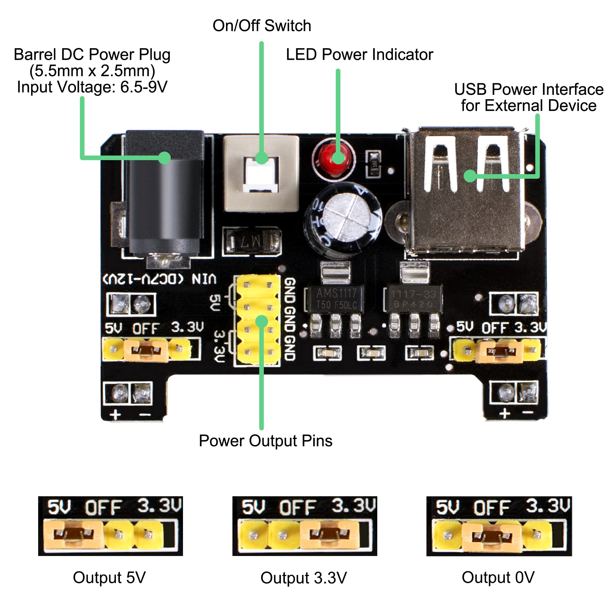 Two ways to power: The power supply module can be powered by USB or a 6.5V–9V DC adapter. Output voltage: 3.3V / 5V. Maximum output current: <700mA.