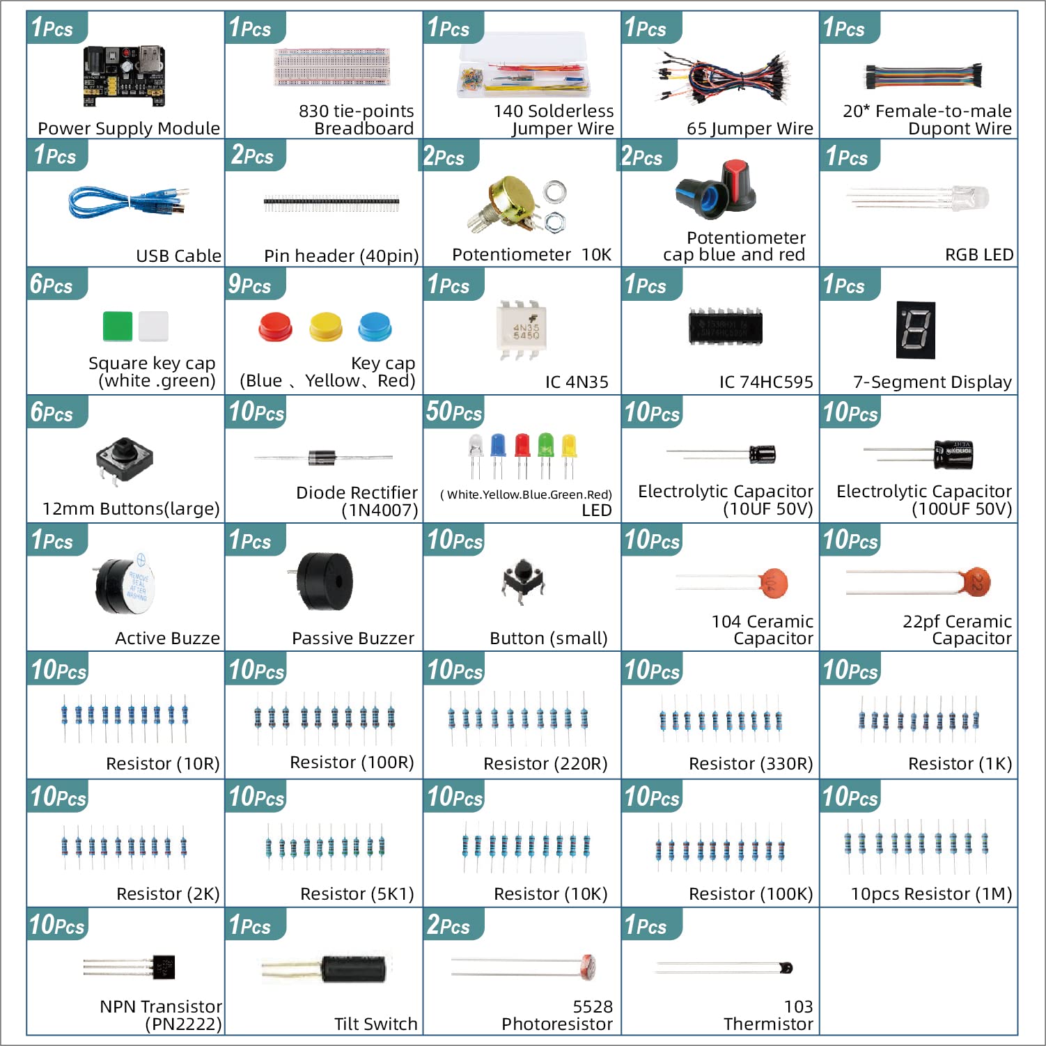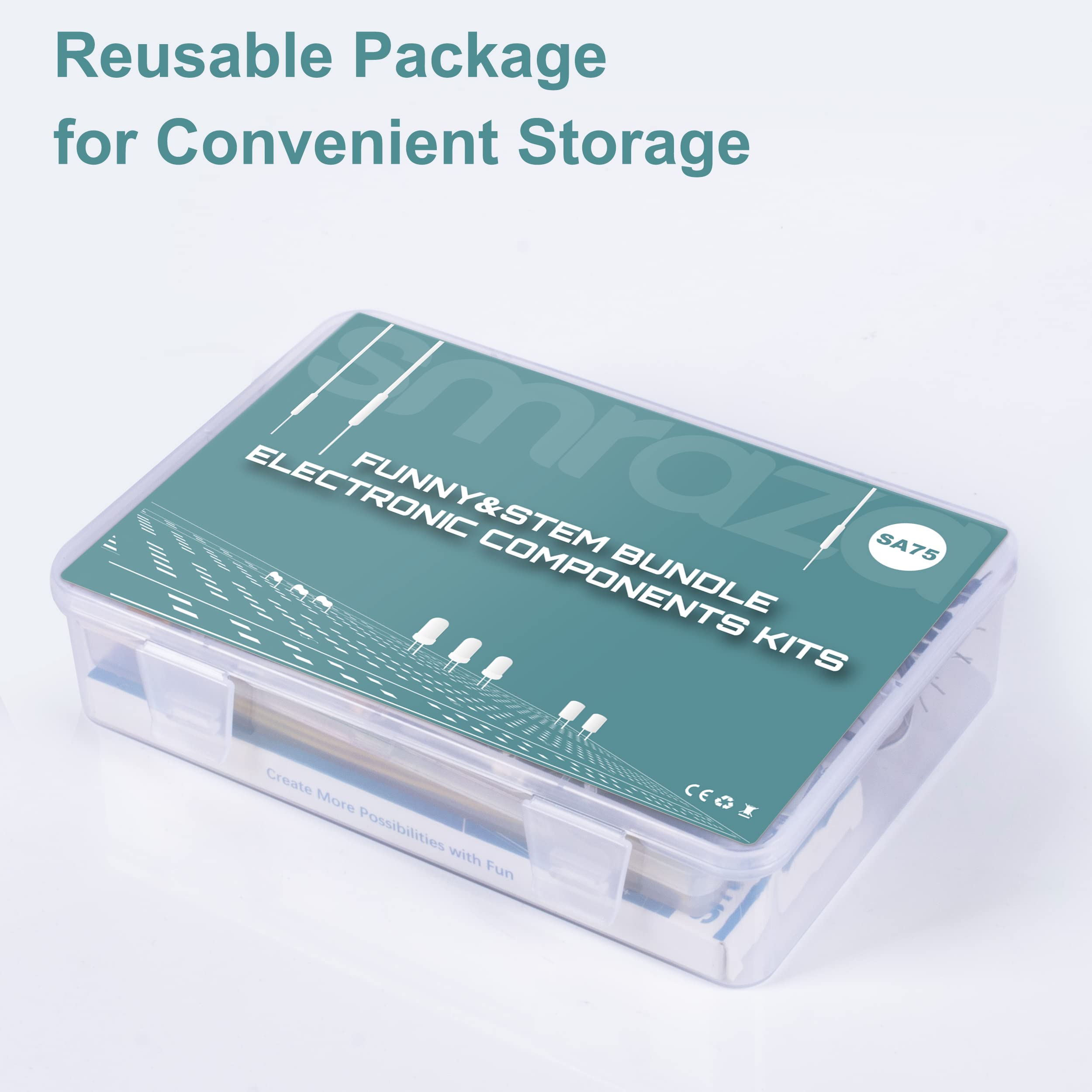 individual Convenience Package:All components are well-stored in a sturdy box, with commonly used electronic parts—including resistors, LEDs, transistors and ICs—individually packaged and labeled.