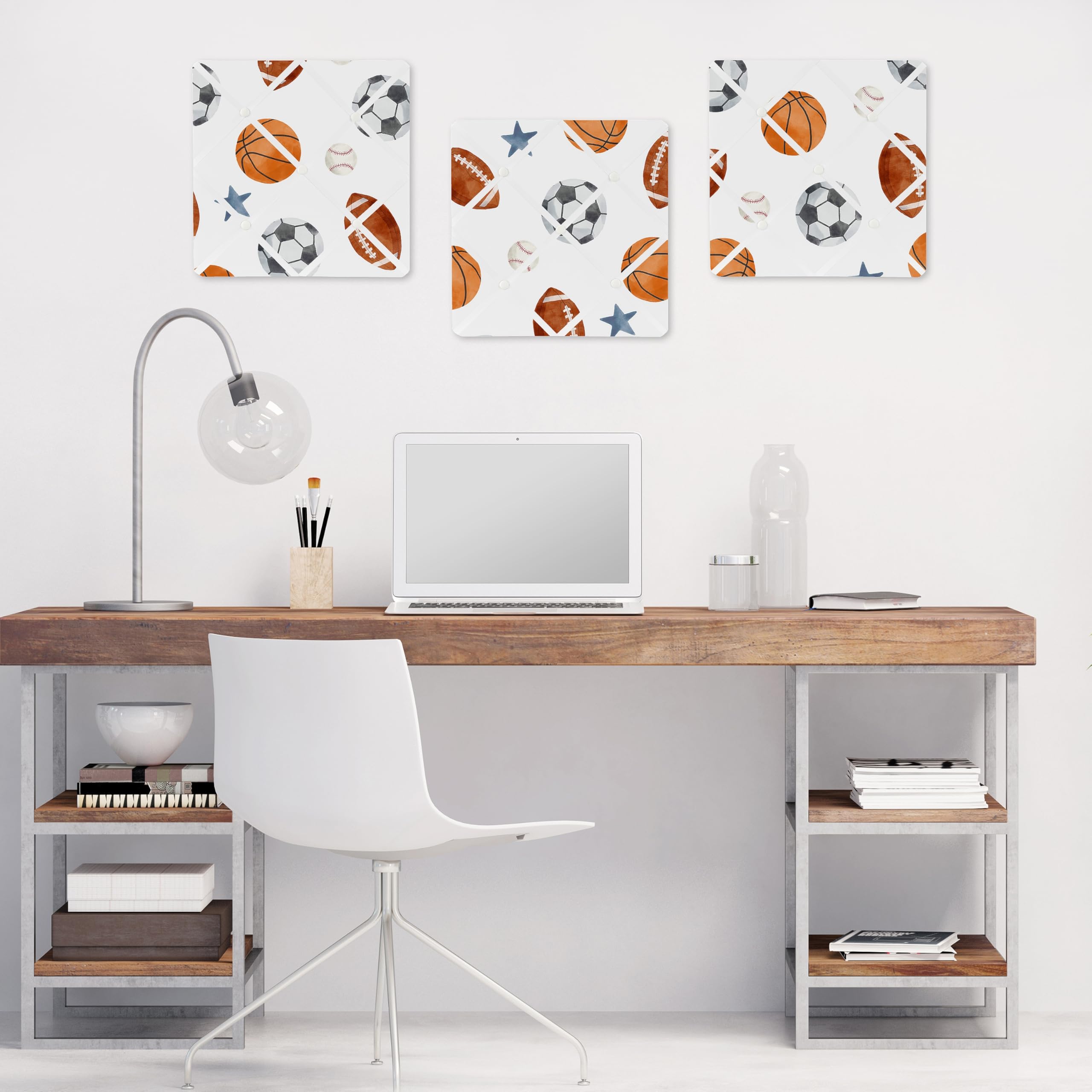 This decorative bulletin board was created to match the Watercolor Sports Theme Collection and made of brushed microfiber fabric featuring an exclusive design of watercolor vintage sports theme soccer balls football baseball basketball blue stars sport themed print with stylish coordinating button detailing and criss cross ribbon made to hold your favorite tangible memories.