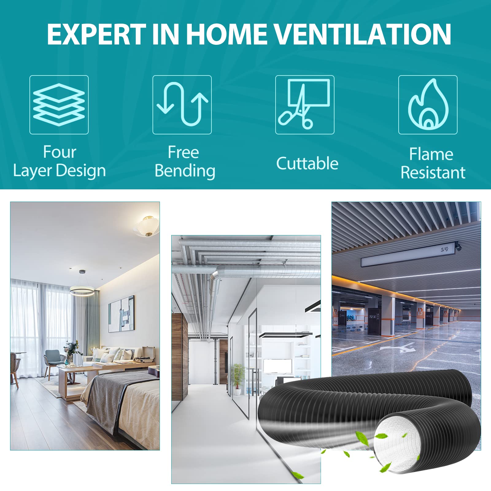 Heavy Duty Duct Hose: The 5” flexible ducting features 3-layer protection, is made of aluminum foil + PET that protects the ducting from cuts and tears, and the outer layer of black PVC all while resistant to leaks.