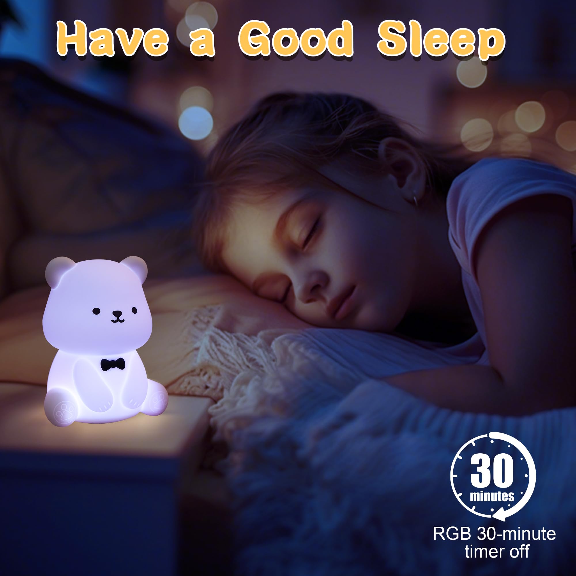 Easily Tap Control: Switch the button to the “RGB”, and the light will on. Just tap or pinch the little bear to change 7 RGB lights. On RGB mode, the light will auto off after 30 minutes. Switch the button to warm light, tap again to adjust 3-level brightness to meet your different needs.