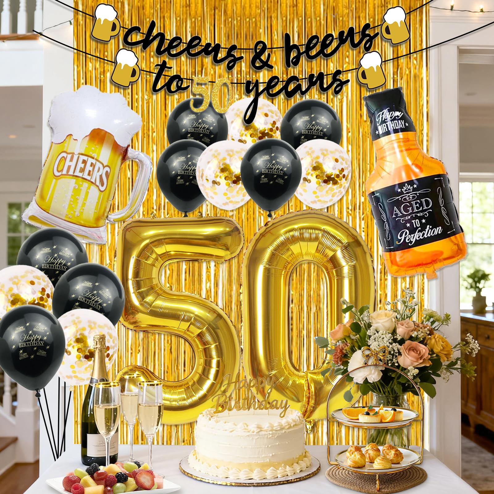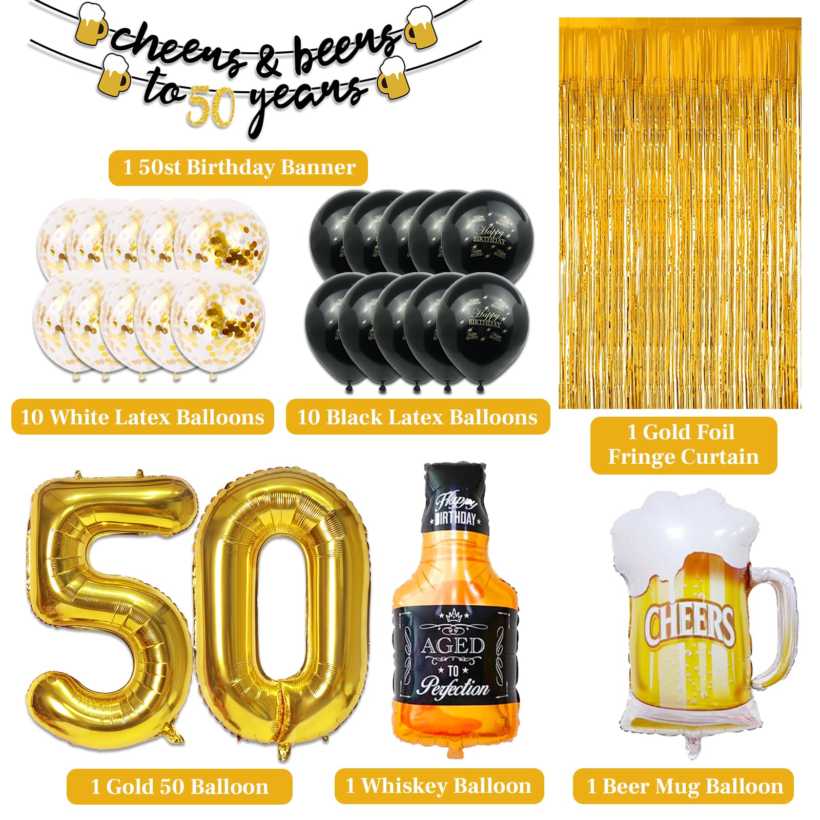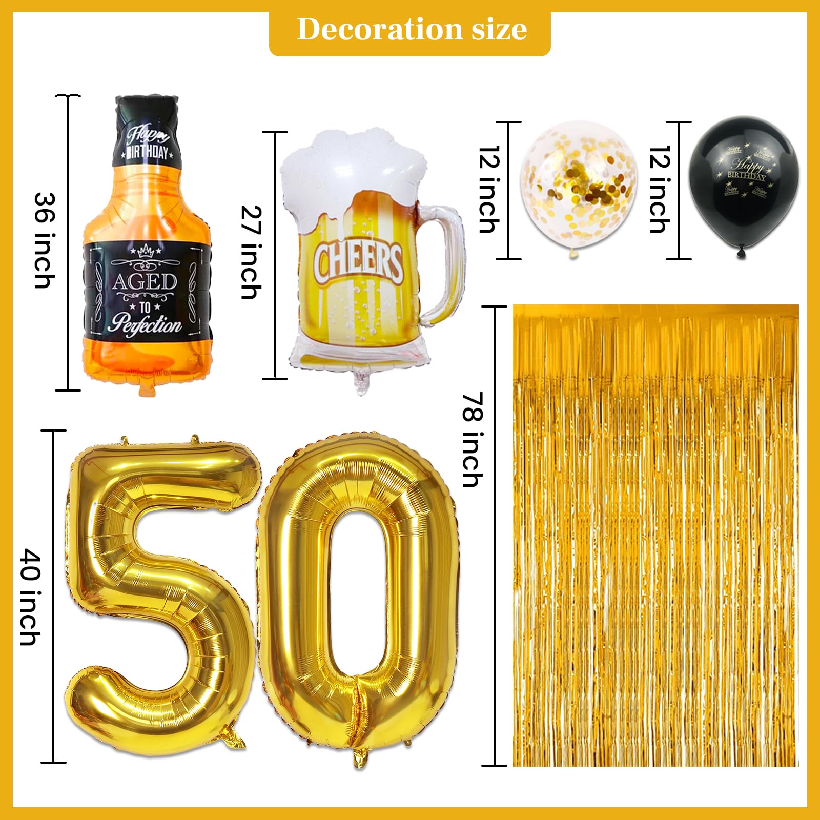 What You Will Receive: 50th Birthday Decorations men included 1pcs 40" gold balloons of number 50, 10pcs 12" gold confetti balloons, 10pcs 12" black latex balloons , 1pcs large size bottle balloon, 1pcs mug balloon, 1pcs gold backdrop fringe curtain and 1pcs "Cheers to 50 Years" birthday banner