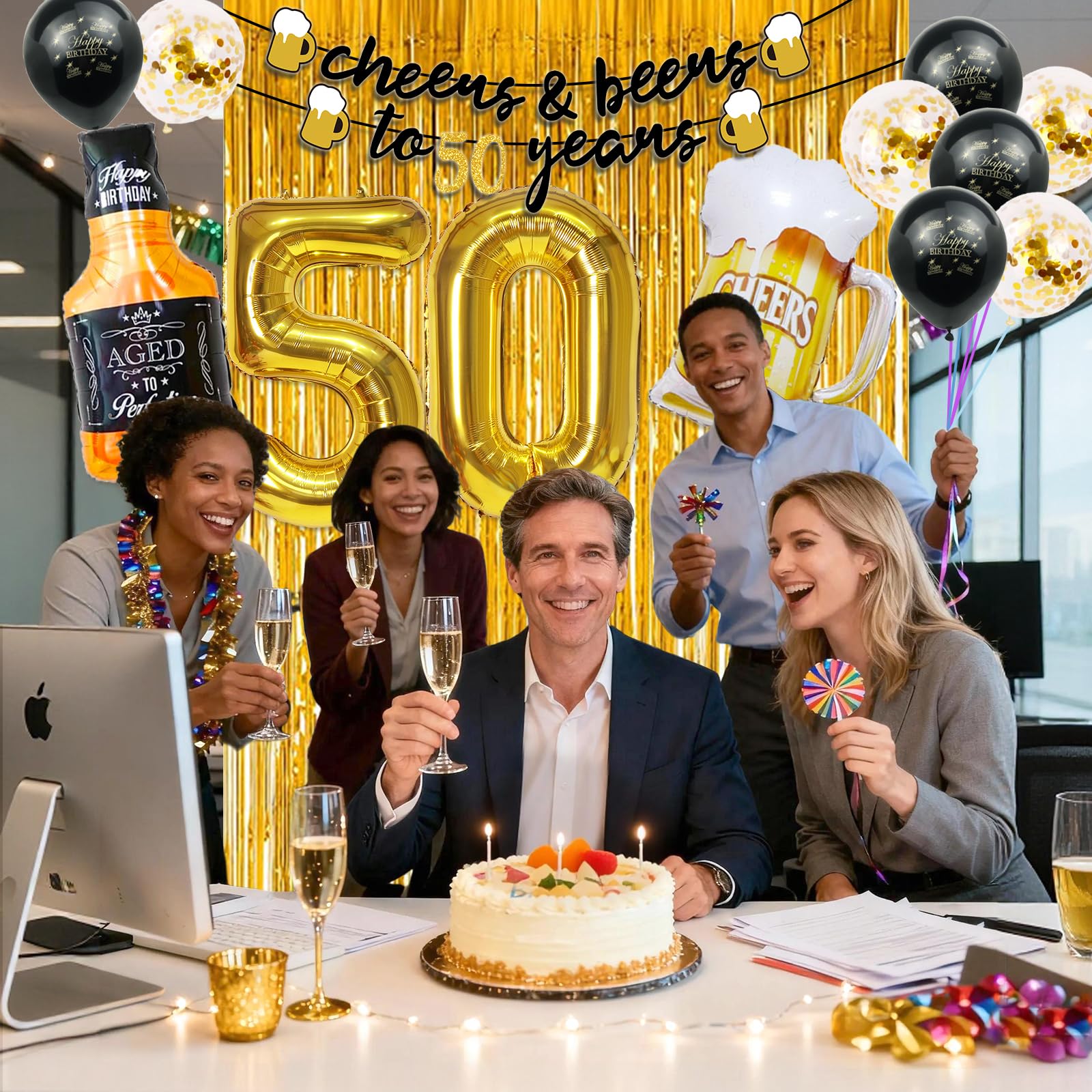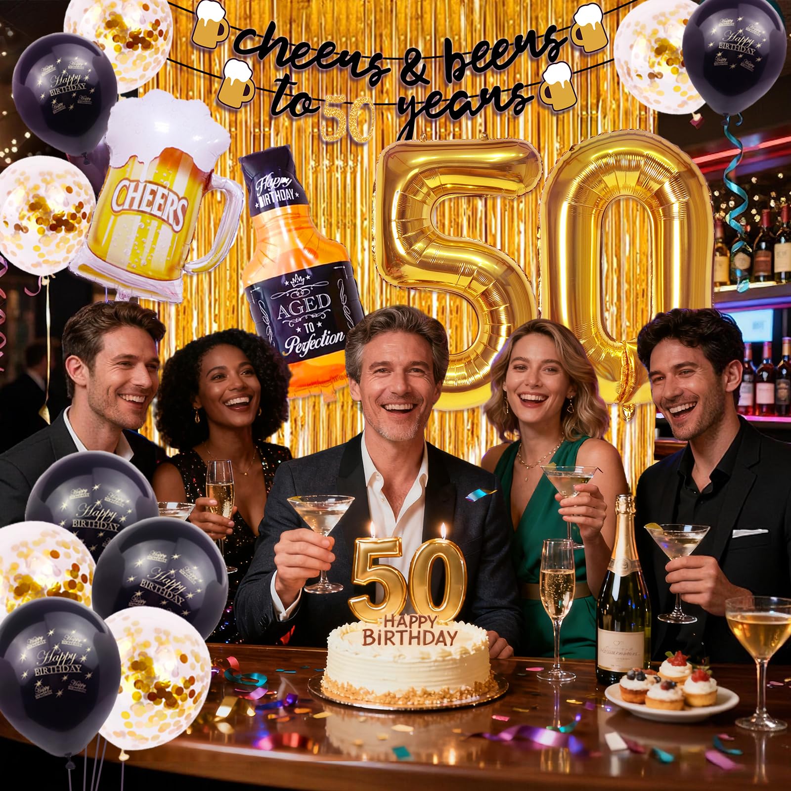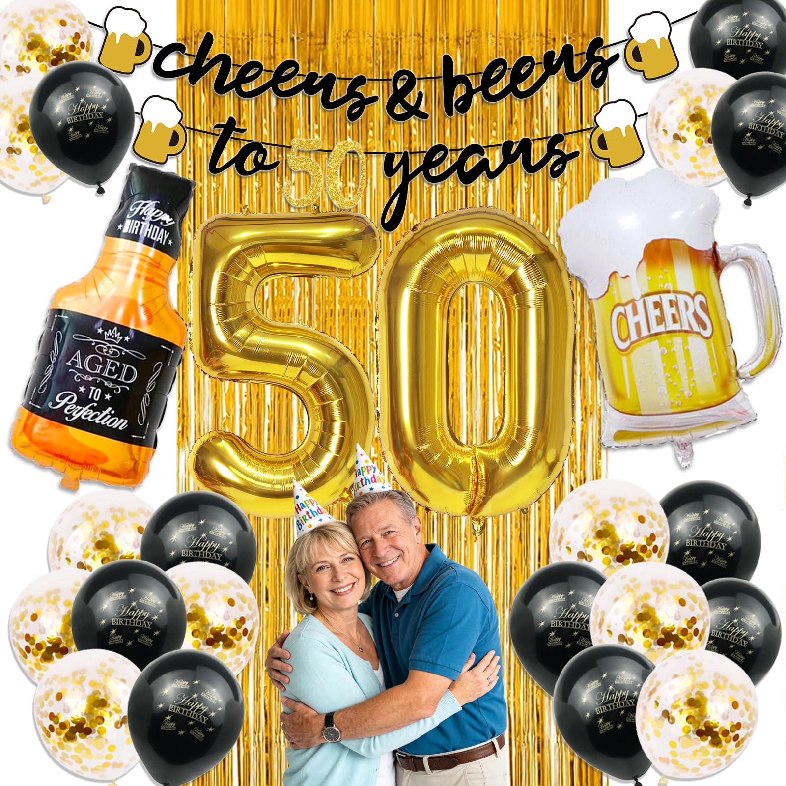 What You Will Receive: 50th Birthday Decorations men included 1pcs 40" gold balloons of number 50, 10pcs 12" gold confetti balloons, 10pcs 12" black latex balloons , 1pcs large size bottle balloon, 1pcs mug balloon, 1pcs gold backdrop fringe curtain and 1pcs "Cheers to 50 Years" birthday banner